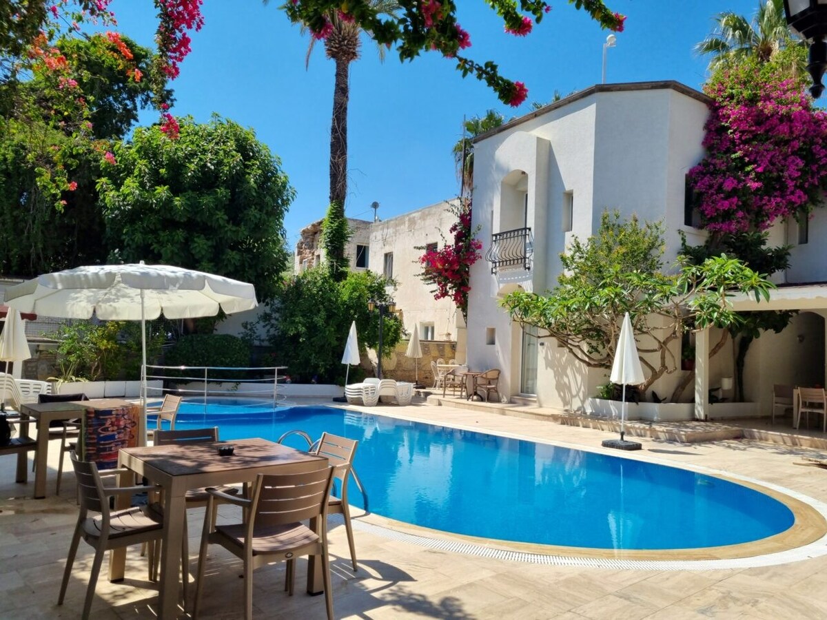 Մեր հոսթելը գտնվում է հենց Բոդրումի կենտրոնում: Մեր սենյակներում կա զուգարան, լոգասենյակ, օդորակիչ և Wi - Fi ։ Մեր հեռավորությունը մինչև ծով 30 մետր է, այսինքն ՝ 1 րոպե հեռավորության վրա, և այն գտնվում է բարերի փողոցից 3 րոպե հեռավորության վրա ։ Մեր 12 սենյակները ծառայում են մեր հարգարժան հյուրերին ամռանը և ձմռանը: Մեր հոսթելն ունի մինի այգի և խոհանոց ընդհանուր տարածքում, որը մենք հասանելի ենք դարձնում մեր հյուրերին: Մեր հոսթելի կողքին կան խոշոր շուկաներ և դեղատներ ։