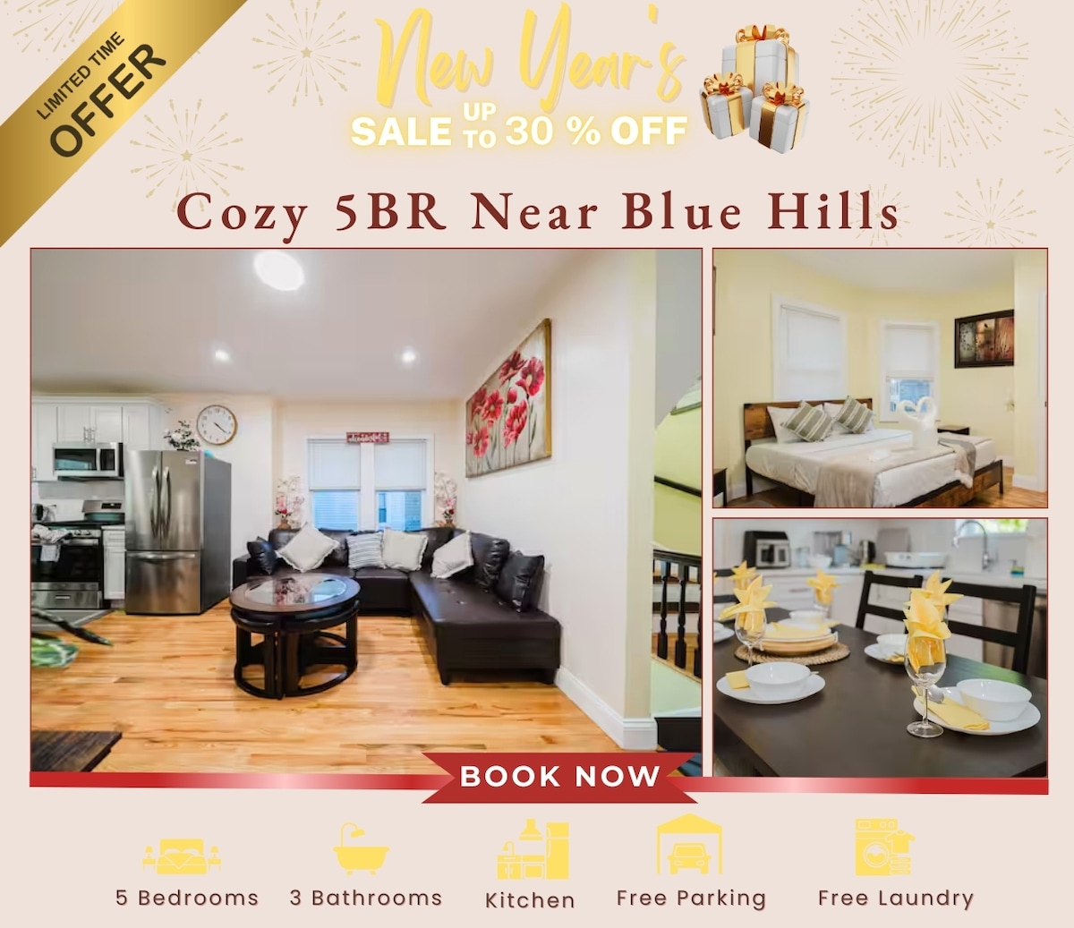 Մեկ ննջասենյակով հարկաբաժին ՝ լավ ձևավորված բաց տարածքով, հյուրասենյակ ։ Queen մահճակալ և երկտեղանի մոդուլային բազմոց և ըստ ցանկության օդային մահճակալ ։ Լոգան օդանավակայանից 15 մղոն հեռավորության վրա և գտնվում է մայրուղուց դուրս գալուց ընդամենը 2 մղոն հեռավորության վրա ։ Հարմարավետ մայրուղի դեպի Բոստոն, Ֆոքսբորո մարզադաշտ և Քեյփ Քոդ ։ Բլյու Հիլզ արշավային արահետներից, առևտրի կենտրոնից, առևտրի կենտրոններից և ռեստորաններից քիչ հեռու ։ Մի քանի թաղամաս քայլեք դեպի ավտոբուսի կանգառ ՝ Բոստոն հասարակական տրանսպորտից օգտվելու համար ։ Բազմազան համայնք և ընտանեկան ։
