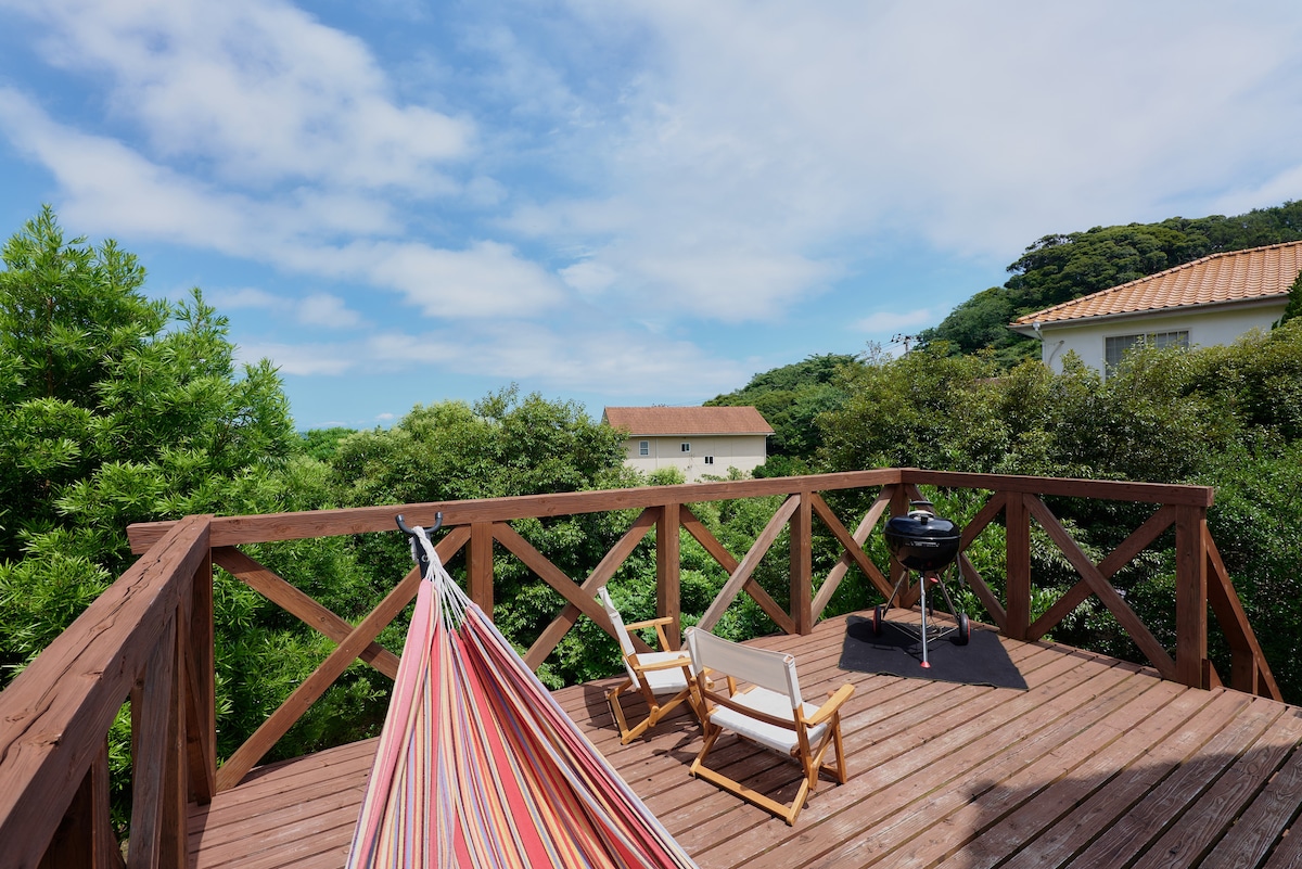 Քոթեջ բլրի վրա, որը նայում է Շիմոդա Շիրահամա ծովին:Չնայած այն գտնվում է բլրի վրա, այն լավ վայր է ազգային մայրուղու երկայնքով:Սա իրար կողքի երկու տներից մեկն է ։Կտուրից և պատուհաններից երևում է կապույտ ծովը, երկինքն ու կանաչապատ տարածքը, իսկ ինտերիերը լցված է փայտի ջերմությամբ ։Այն կատարյալ վայր է ծովային սպորտի համար հիմք օգտագործելու կամ ձեր ճանապարհորդության հոգնածությունը բուժելու համար:Գտնվում է Pension Garden Villa Shirahama-ի տարածքում: * Մենք պատրաստել ենք բաներ, որպեսզի դուք վայելեք հանգստավայրը:Հարևանությամբ կա նաև սենյակ ։Խնդրում ենք զերծ մնալ երեկույթներից կամ աղմուկից:Ձեզնից կարող է պահանջվել հեռանալ: * Ես մուտք չունեմ դեպի բացօդյա լոգարան կամ ճաշասենյակ ։