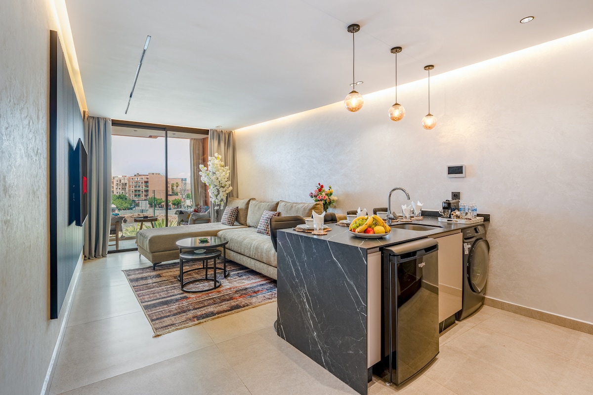 Un cocon contemporain, mêlant design moderne et charme marocain. À seulement quelques pas de la gare de Marrakech et entouré de cafés, restaurants et boutiques, c’est la base idéale pour explorer la ville : • 7 minutes du Jardin Majorelle • 1 minute d’un Carrefour Market • 5 minutes du Musée Yves Saint Laurent • 9 minutes de la place Jemaa el-Fna • 10 minutes des Jardins Secrets • 14 minutes de l’aéroport de Marrakech • 35 minutes du désert d’Agafay ☀️ 🐫 🍊