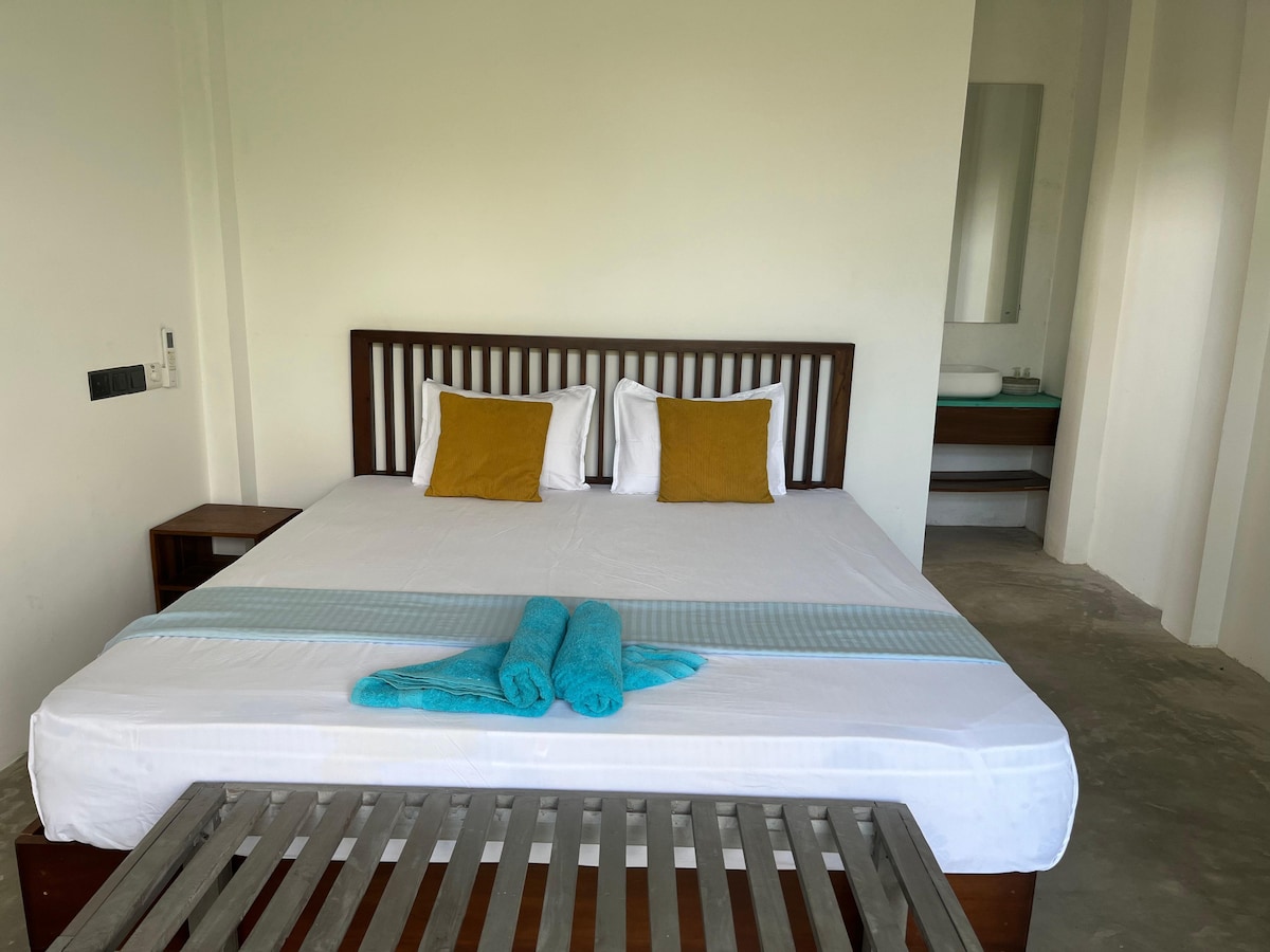 With AC Fall asleep to the sound of the ocean at our peaceful haven in the heart of idyllic Madiha village. Each of our three double bedrooms has a comfy double bed with brand-new mattresses, bespoke Sri Lankan-made furniture including a desk and chair, polished cement bathrooms with airy showers, and a private terrace. Your private deck unfolds directly into our cafe and restaurant where delicious breakfasts, lunches, and dinners await.