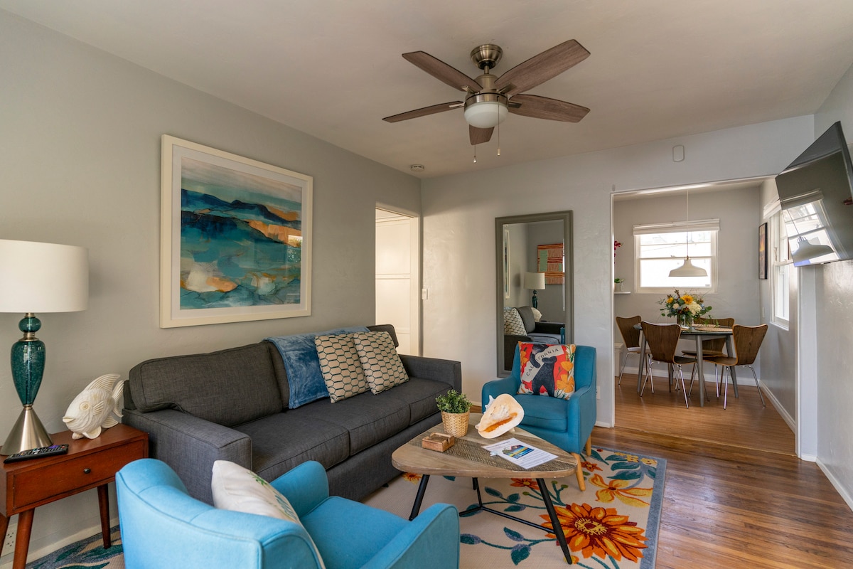 Օվկիանոսից ընդամենը երեք թաղամաս հեռավորության վրա գտնվող մեր հարմարավետ քոթեջը Սան Դիեգոյի իդեալական հանգիստն է ։ Կանաչ դռների քոթեջը գտնվում է արտասովոր Օուշըն Բիչում գտնվող աղմկոտ տարածքի սրտում ՝ լավագույն ռեստորաններից, համտեսման սենյակներից, յոգայի ստուդիաներից և խանութներից ։ Վայելեք անվճար կայանատեղի մեկ մեքենայի համար և բերեք ձեր շանը: Շների լողափը և շների զբոսայգին գտնվում են մի քանի թաղամաս հեռավորության վրա ։ Տունը նախագծված է նորաոճ դեկորներով և A/C - ով ՝ հարմարավետության և զվարճանքի համար: Մենք ողջունում ենք բոլորին մեր տանը: