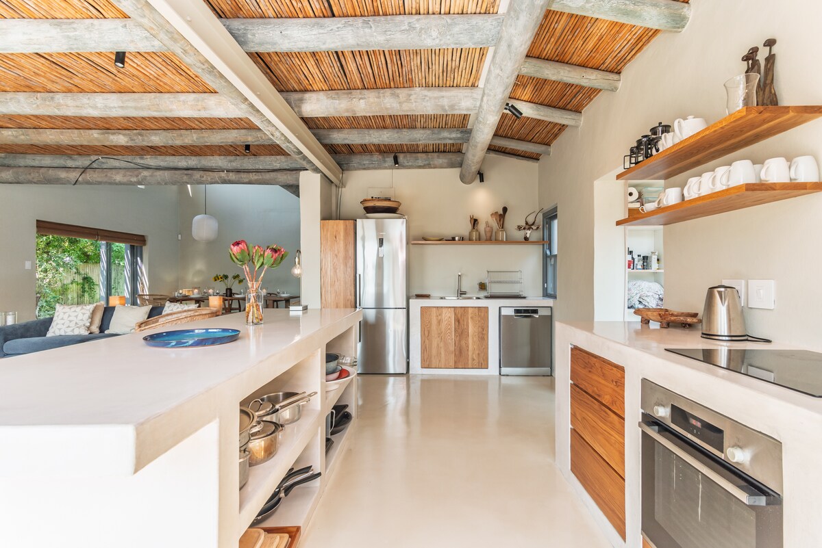 Ծովափնյա լեռնային հանգիստ բացառիկ միստիկ ժայռերի արգելավայրում ՝ անծայրածիր տեսարաններով, լողավազանով և մեծ ֆիբոս պարտեզով ՝ դեպի լողափ տանող մասնավոր ճանապարհով ։ Այս ճարտարապետի նախագծած փայտե բունգալոն կատարյալ է Քեյփթաունն ու Հարավային թերակղզին ուսումնասիրելու կամ պարզապես արգելելու և հանգստանալու համար ՝ պահպանական գյուղի վճիտ ընկղմման մեջ ։ 2 մեծ en - Suite ննջասենյակ, ինչպես նաև հարմարավետ լոֆթ և լրացուցիչ երկհարկանի մահճակալներ երեխաների համար: Տունը գտնվում է Քեյփթաունի կենտրոնից ընդամենը 45 րոպե հեռավորության վրա ։