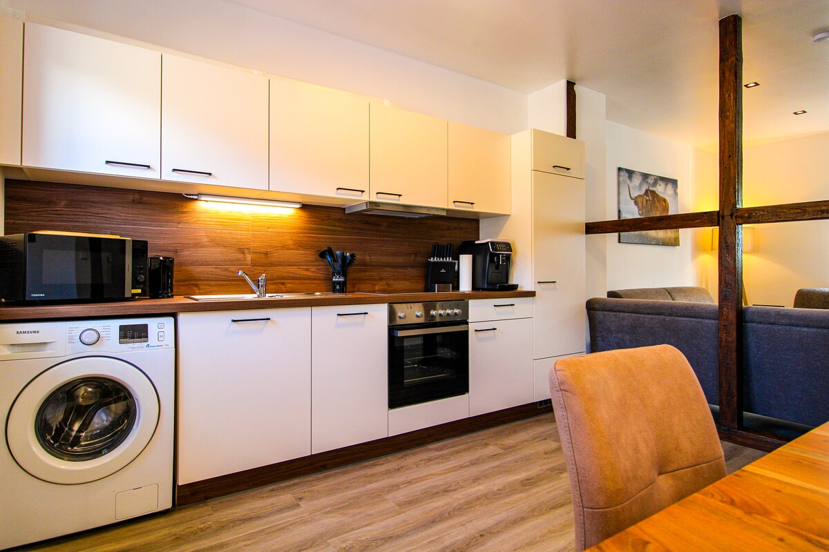 Liebevoll eingerichtete Wohnung für Paare und Alleinreisende, die Ruhe und Komfort suchen. Ein gemütliches Schlafzimmer mit Doppelbett und viel Stauraum sorgt für erholsame Nächte. Die moderne, voll ausgestattete Küche lädt zum Kochen ein. Im Bad erwartet dich eine gepflegte Regendusche. Schnelles WLAN, Smart-TV, Essbereich, stilvolle Details und eine ruhige, dennoch gut angebundene Lage machen den Aufenthalt perfekt.
