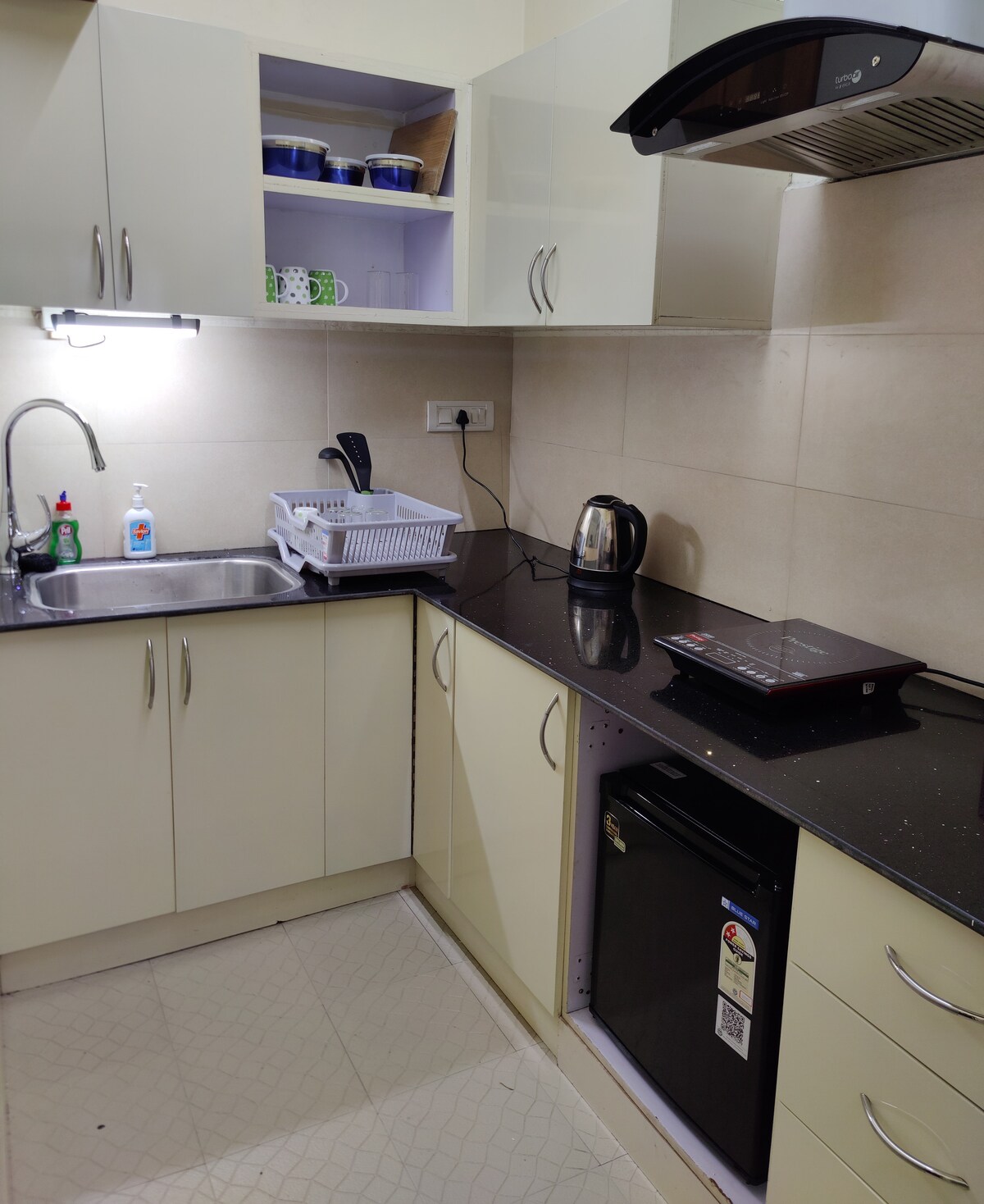 Private residential area, with a fully functioning kitchen where guests can prepare dishes of their choice. However there is a restaurant a few minutes away from the house where they can order food if they want. There are three bedrooms- one single room and two double bedrooms. Double bedrooms have attached bathrooms. There are two other common area bathrooms. On the top floor there is a little book nook with a collection of books where guests can read and relax