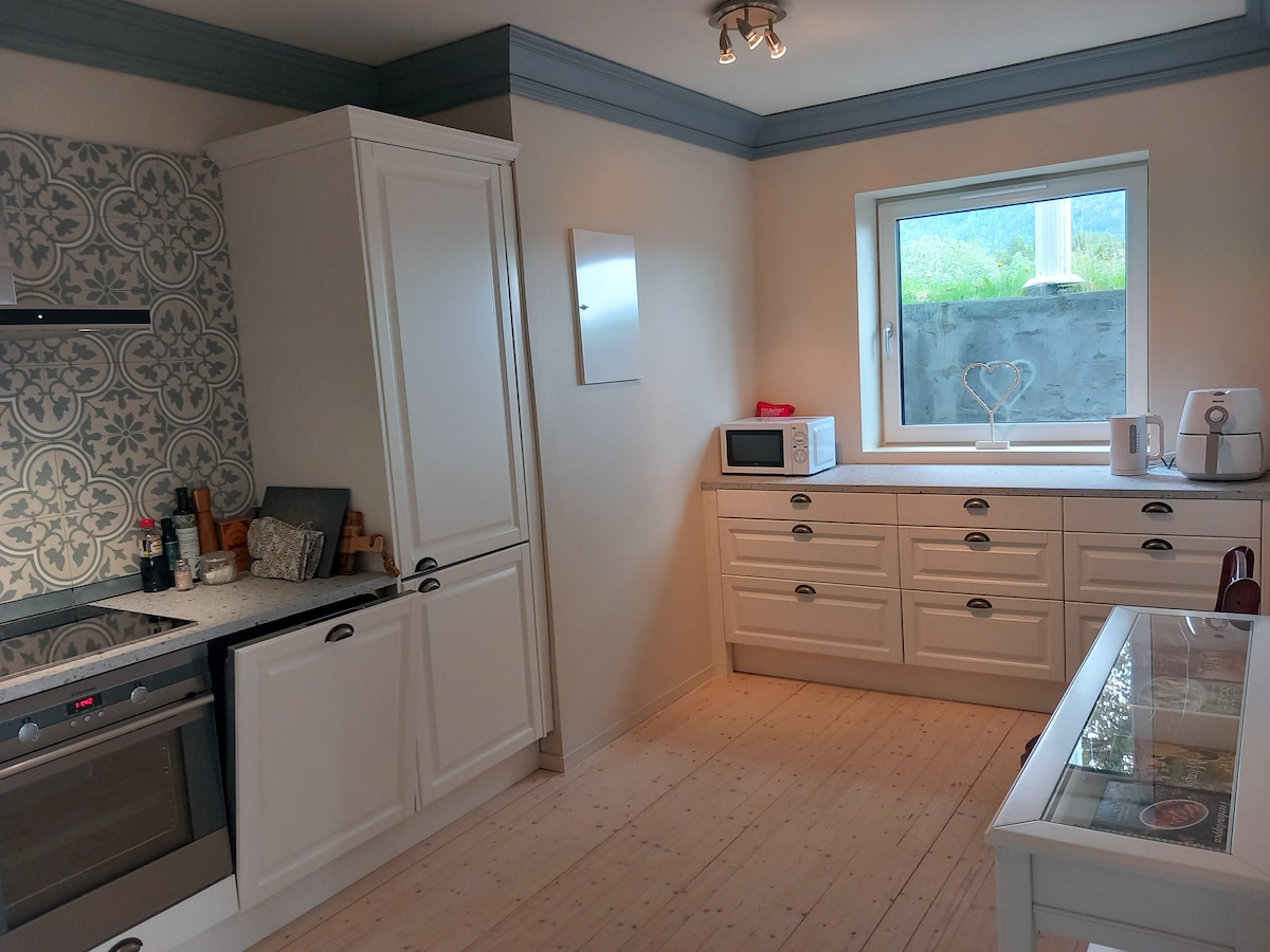 A fully renovated apartment on the first floor of a single-family home. The area is quiet and nice, with a short walk to a big shopping mall (Moa - 10 min walk) and bus stops (5 min walk, 25 min bus ride to city centre). If you are interested in hiking, there are many nice locations just a short drive away. This area has a nice view of the "Summøre Alps". The walk to the shoreline takes about 10 minutes. Outside the house there is a large driveway with parking.