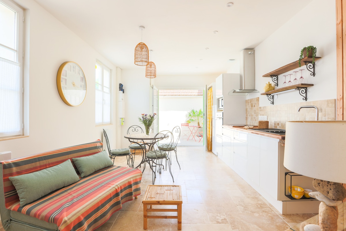 Petit nid douillet & lumineux. De 30 m2. De plain-pied. Tout neuf. Niché dans une impasse. Au grand calme. Terrasse exposée sud-ouest avec salon de jardin, parasol et chaises longues. Parking privé. Pour des raisons d'hygiène et d'allergie, les animaux domestiques ne sont pas autorisés. Possibilité de déposer de gros objets (porte-vélos) dans le jardin / votre coffre de voiture. Non dans le gîte de 30 m2.