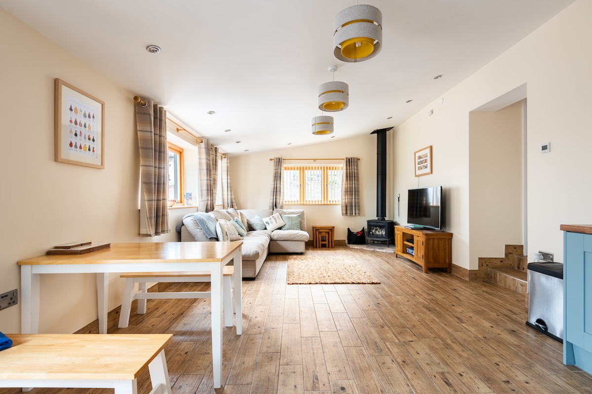 {Տաք լոգարան ՝ լրացուցիչ արժեքով ։ Խնդրում ենք հաղորդագրություն ուղարկել ազատ ամսաթվերը ստուգելու համար:} Գեղեցիկ վերանորոգված հին կաթնամթերք ՝ բոլոր մոդայիկ հարմարություններով ։ Գերարագ Wi - Fi ։ Բաց հատակագծով բնակելի տարածք, հարկի տակ ջեռուցում, հարմարավետ բազկաթոռներ և բազմոց, նախաճաշի բար, սալաթե հատակ, կաղնու ճառագայթներ, փայտի այրիչ ։ Տեղադրված է AONB - ի եզրին ՝ մասնավոր դրսի տարածքով ։ Հետանցքներ շեմից ։ Կատարյալ հիմք բացօթյա սիրահարների կամ նրանց համար, ովքեր ցանկանում են լիցքաթափվել և փախչել այդ ամենից ։