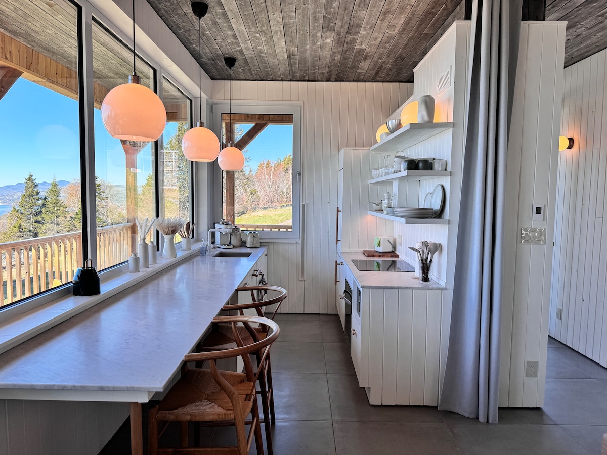 Small Scandinavian chalet for two people ideally located to enjoy the attractions of Charlevoix. It has a thermal circuit (hot tub, sauna, hammam) Very intimate and in the middle of the woods, the view overlooks the majestic river and the mountains in the distance. All the modern equipment is there and the comfort is absolute A/C and outdoor fireplace. The open concept design was designed for an immersive experience in nature: large windows, panoramic shower. Access via a private road at 500 m.