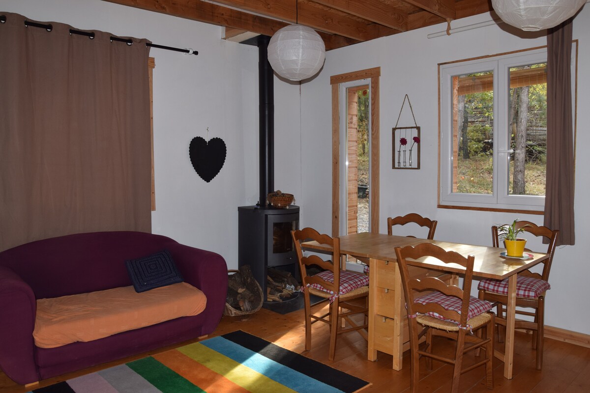 Chaleureux gite dans une maison en bois pour 4 personnes. Jardin et terrasse aménagés avec salon, table et chaises au soleil de la Provence. A env 20 min à pied du centre de Dieulefit et proches divers loisirs et balades. gentils animaux sur place: poules, lapins, chats,chien et parfois cheval! Ménage non compris.