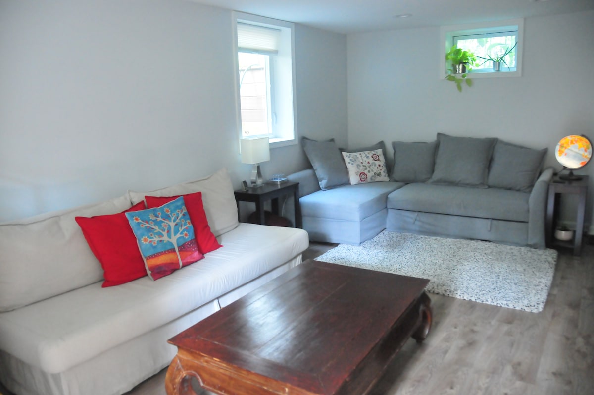 Վայելեք հարմարավետ և առանձին հանգիստ այս մեծ նկուղային սուիտում, որն ունի սեփական մուտք։ 1,9 մղոն մինչև մետրոն։ Կատարյալ է զույգերի, միայնակ ճանապարհորդողների կամ փոքր ընտանիքների համար։ Այն ունի հարմարավետ ննջասենյակ՝ queen-size մահճակալով, լավ լուսավորված, ընդարձակ հյուրասենյակ (20 ֆուտ x 10 ֆուտ), երկտեղանի մահճակալ-բազմոց և զուգարանով լոգասենյակ՝ առանձին ցնցուղով։ Հեռուստացույցը (Roku և YouTube TV) առաջարկում է բազմաթիվ ժամանցային հնարավորություններ, մինչ դուք սուրճ և թեյ եք վայելում սրճեփ մեքենայով, էլեկտրական թեյնիկով և բոլոր սպասքներով հագեցած հյուրասենյակում։