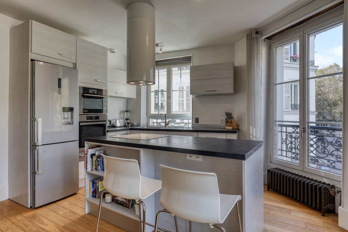 My typically Parisian, well-lit and AC equiped apartment is on the last floor of a charming apartment building with an elevator. It is in the hip Rue des Martyrs area, with a lively local presence and many cafés, bars and restaurants. It is only a short walk to Montmatre, the Moulin Rouge and Opera, and 3 metro lines (2,7,12). There is a magnificent view from the living room balcony over the roofs of Paris and the Eiffel tower. Well equiped kitchen and high-speed wifi.