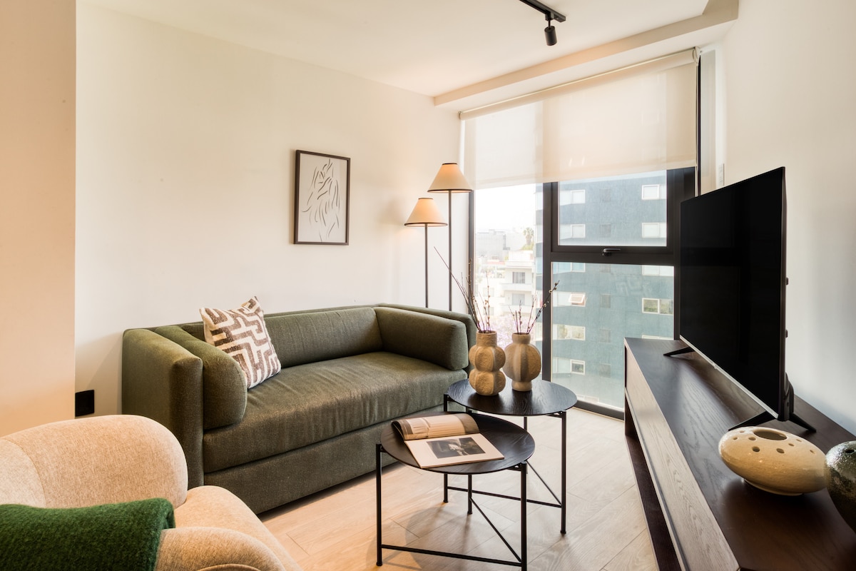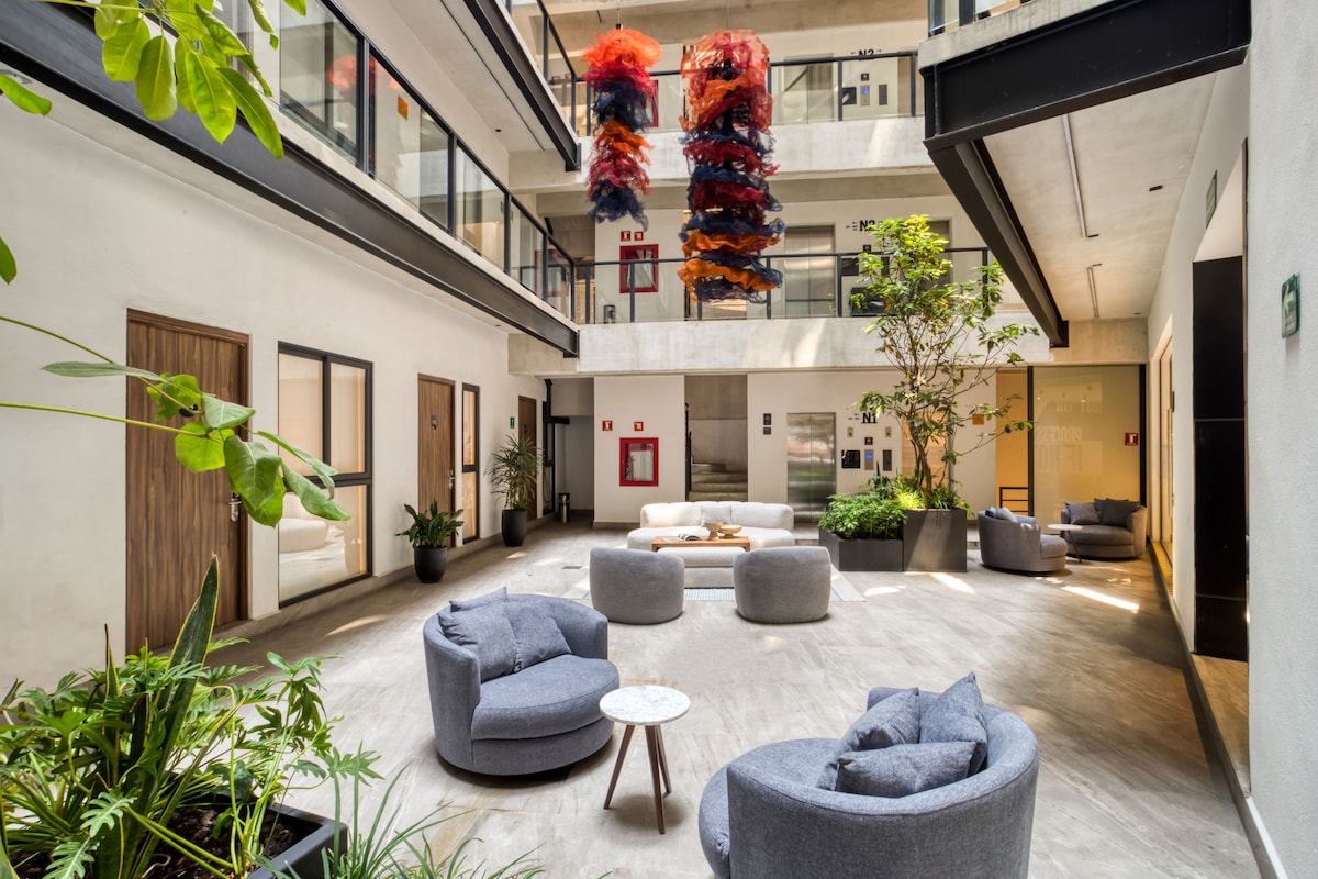 Ռոմա Նորտի այս նորաոճ բնակարանն առաջարկում է կատարյալ կարգավորում թվային քոչվորների համար ՝ գերարագ Wi - Fi, խնամված աշխատանքային տարածք և աստիճաններ Կոնդեսայի ամենաթրենդային սրճարաններից, ռեստորաններից և գիշերային կյանքից: Վայելեք բարձրակարգ հարմարություններ ՝ բիզնես կենտրոն, ամբողջական մարզասրահ, խաղասենյակ և ցնցող տեսարաններով տանիք ։ Մնացեք արդյունավետ, ոգեշնչվեք և զգացեք CDMX - ը տեղացու պես ։
