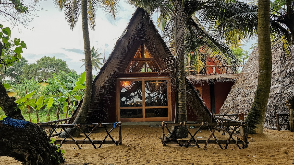 A-frame häuser direkt an einsamen malerischem strand, unter palmen und mangroven. 4 km südlich vom surf-hotspot hikkaduwa, entfernt von strassen & eisenbahn lärm. rundum naturnah!: beobachte tiere und insekten (kakerlaken: gruselig aber harmlos). erlebe das authentische fischerdorf DODANDUWA. backpackers 0-stern standart/ co_living/ wifi 2 cabanas, 1 rooftop cabana, wohnung mit 2+1 separates zimmer, je 2 betten. gemeinschaftsküche. SNACKBAR & essen in zusammenarbeit mit LAGOON hotel.