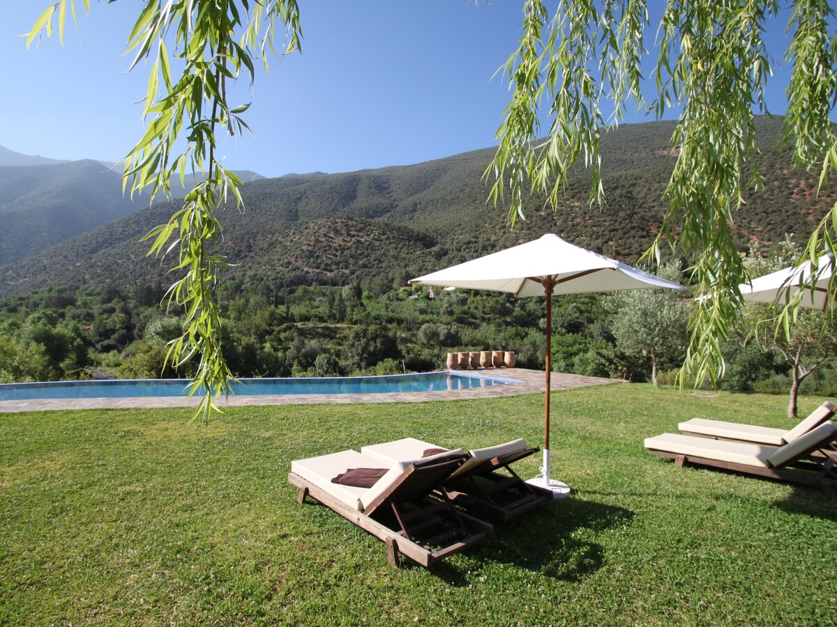 Դուք մտնում եք բերբերական ոճի տուն, որը միավորում է ավանդական հմայքը ժամանակակից հարմարավետության հետ: Իսկական ճարտարապետությունն աչքի է ընկնում բարձր առաստաղներով և մեծ պատուհաններով, ինչը թույլ է տալիս բնական լույսին հեղեղել տարածքը ։ Ներսում ամեն ինչ նախագծվել է ՝ հաշվի առնելով ձեր հարմարավետությունը ՝ հետադարձելի օդորակիչ, Wi - Fi և սառնարան ։ Դրսում փարթամ այգի է ծաղկում Ատլասի լեռների փառահեղ հայացքի տակ ՝ ստեղծելով յուրահատուկ մթնոլորտ, որտեղ ավանդույթներն ու արդիականությունը համախմբվում են ներդաշնակ: