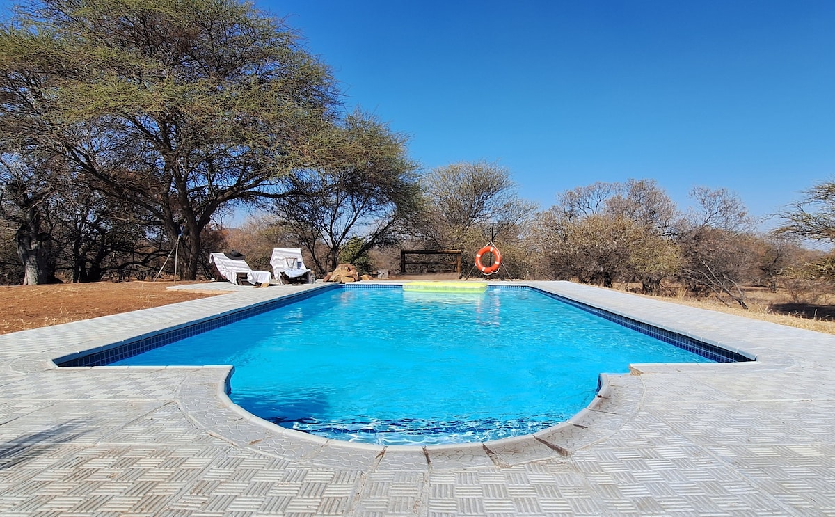 Վերադարձեք և հանգստացեք այս հանգիստ և նորաոճ սաֆարի տնակում: Գտնվելով փառահեղ Պիլանեսբերգ լեռների ստորոտին ՝ այն իդեալական է դարձնում այս տնակը տնակից խաղ դիտելու համար: Առանձին տնակը բաղկացած է 5 առանձին սենյակներից և ընդհանուր տնակային տարածքից: Առավելագույնը 10 հյուր միաժամանակ կարող է այցելել տնակ ՝ մասնավոր և բացառիկ փորձառություն ապահովելու համար: Մեր մասնավոր սաֆարիի ուղեցույցը հյուրերին կտանի սաֆարիով օրական երկու անգամ ( լրացուցիչ ծախս )՝ Մեծ 5 - ը և բազմաթիվ այլ կենդանիներ որոնելու համար
