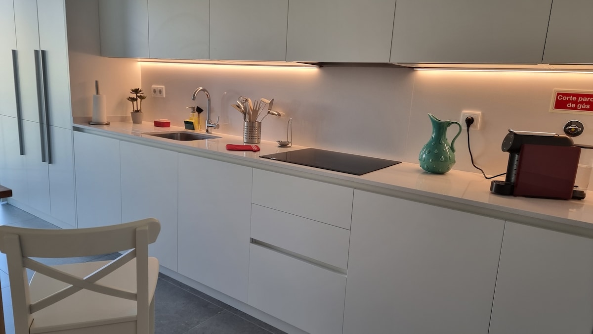Apartamento reconstruído por arquitecto, excelente privacidade, exposição solar, com wifi, e praia a 150m. 1 suite com SPA e banho turco com aromaterapia. 1 suíte com terraço com vista mar, tela de projeção de cinema. Sala com vista de mar, rio, e terraço, onde poderá disfrutar de uma zona de estar e de um barbecue com grelha em ferro forjado. Perto de restaurantes, cafés e supermercado, e estação de comboio. Ar condicionado e piso aquecido em todas as áreas, TV 4K e box independente por suíte.