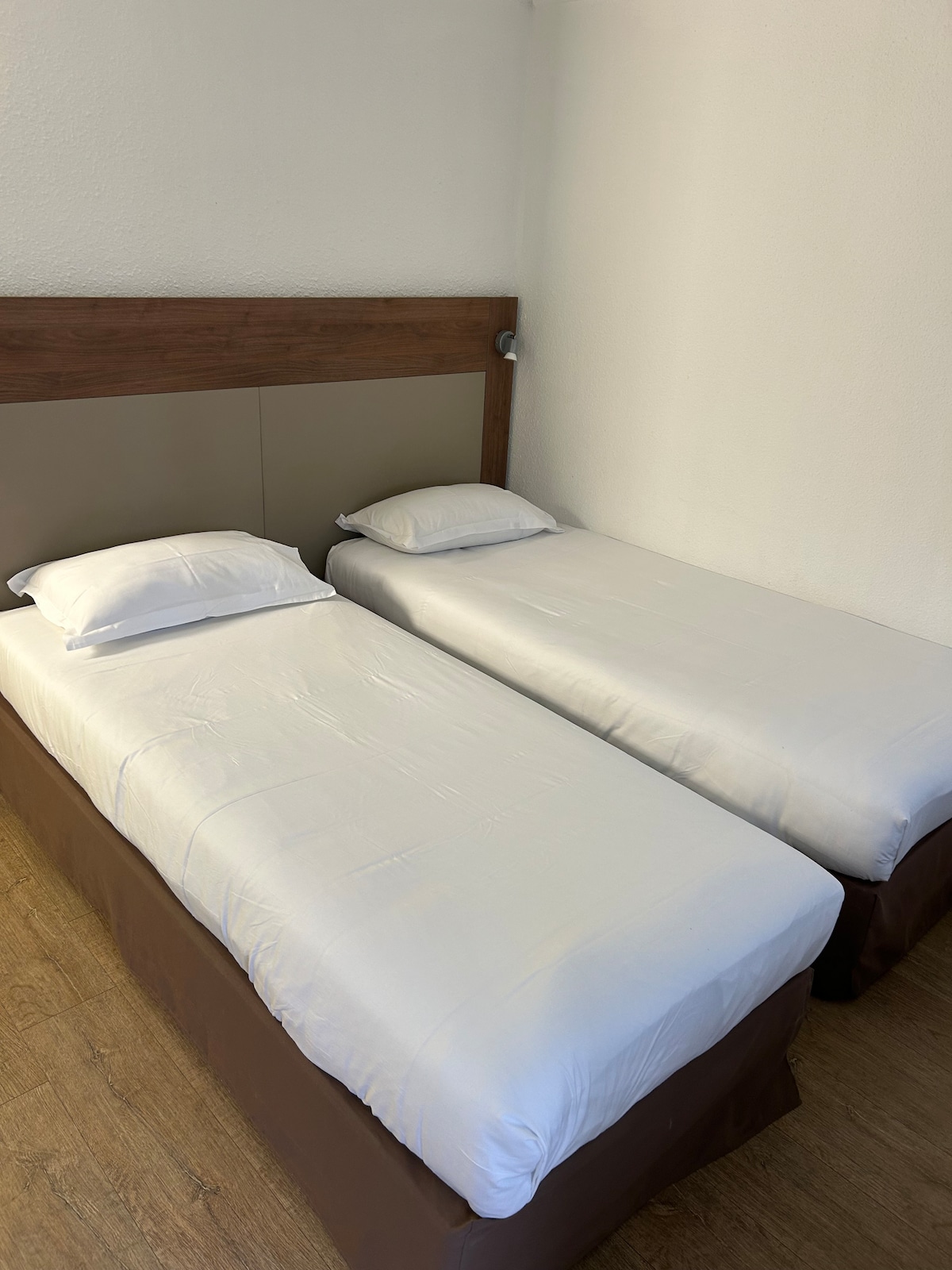 Մեր 19 քմ հարմարավետ երկտեղանի սենյակներն ունեն երկու մեկտեղանի մահճակալ ։ Մեր բոլոր սենյակները տրամադրում են առանձին լոգասենյակ, գրասեղանի տարածք, անվճար գերարագ Wi - Fi և հարթ էկրանով հեռուստացույց ՝ ավելի քան 30 ալիքով ։