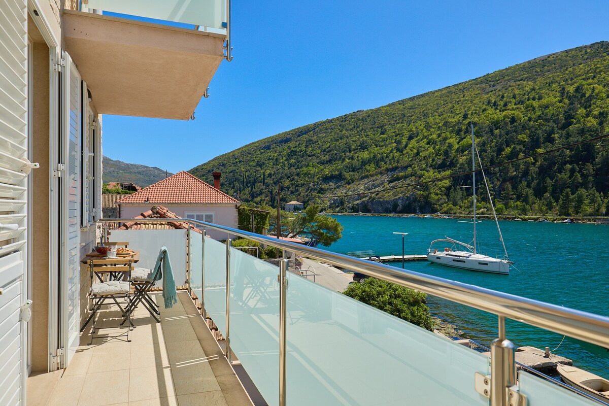 The studio/apartment is located on the first floor of the house and features its own kitchen, bathroom, and private balcony. From the balcony, you can enjoy beautiful views of Boka Bay and the Verige Strait. Guests also have access to the terraces in front of the house, which are arranged on three levels. These terraces offer dining and coffee tables, as well as an outdoor shower — perfect for relaxing and enjoying the fresh sea air.