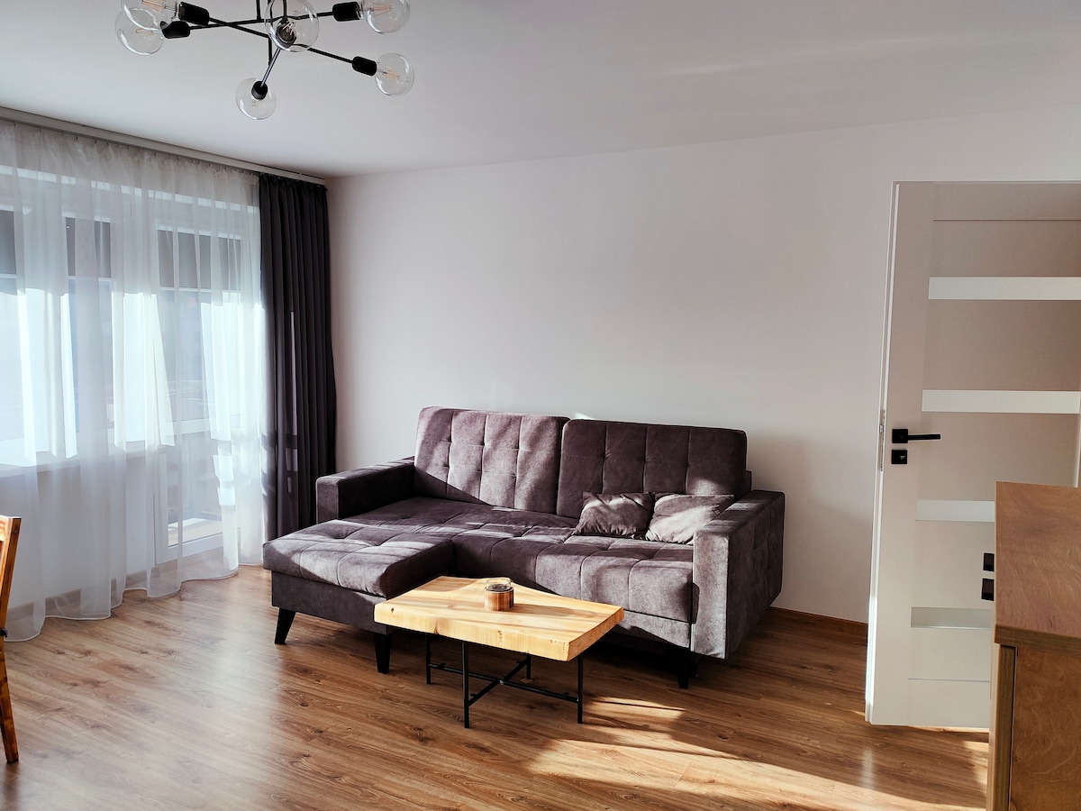 Կատարյալ վայր ընտանիքի կամ ռոմանտիկ հանգստի համար ։ Երկու ննջասենյակ, ընդարձակ լոգասենյակ և ընդարձակ հյուրասենյակ ՝ խոհանոցիկով և 40մ2 պատիոով, կբավարարեն բոլոր նրանց, ովքեր գնահատում են տարածքն ու հարմարավետությունը ։ Բնակարանն ամբողջությամբ կահավորված է, այդ թվում ՝ սպասք լվացող մեքենա, ջեռոց, լվացքի մեքենա, էլեկտրական չորանոց, արդուկ և ինտերնետ: Հյուրերն ունեն անվճար կայանատեղիից օգտվելու հնարավորություն ։ Տարածքում կան բազմաթիվ տեսարժան վայրեր, օրինակ ՝ Krapkowicka Marina - ն, դելֆինների փակ լողավազանը և Մոսնիայի դղյակը ։