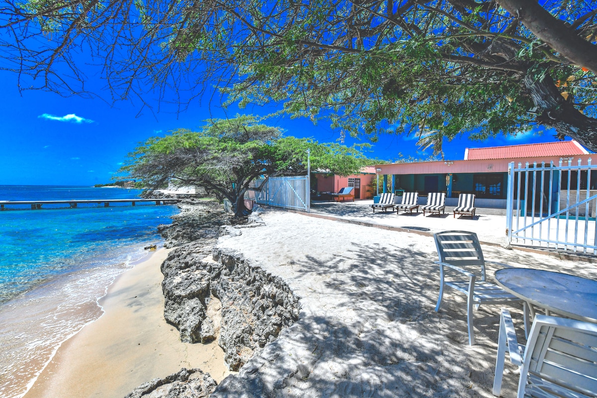 Completely new suite with an oceanfront view. You will be able to experience some of the most beautiful sunsets on the island firsthand! Outside facilities include a gazebo, hammock and dock providing easy access to the ocean, ideal for swimming. Kayaks and snorkeling gear are also available free of charge! Located at a relatively quiet part of the island, known as a prominent fishing area. Some of the best seafood restaurants are located on the same street (Zeerovers and Flying Fishbone).