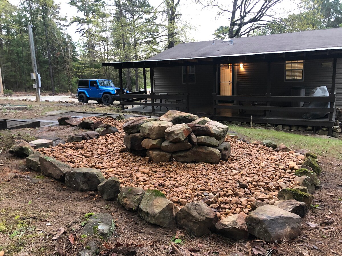 Relax in this native stone rustic cabin built of local rock and cedar logs. With a waterfall trickling into a spring tank pool right outside your back door & a cozy gas log fire beside your queen bed, you’ll never want to leave. Nestled in the Roasting Ear Creek valley on 200 private acres, this cabin is the perfect spot for a couple to relax and unplug. There’s a big screened porch for lounging with a HOT TUB, an outdoor kitchen, dining area, ceiling fans, & beautiful views. **Now with WiFi!**