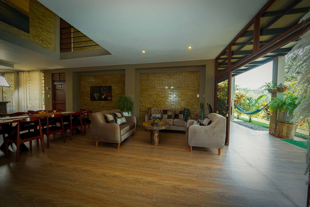 Ապշեցուցիչ վիլլա Մոյոբամբա քաղաքում, որը ներկառուցված է ջունգլիներում և միևնույն ժամանակ ՝ քաղաքում ։ Այն շատ յուրահատուկ և յուրահատուկ սեփականություն է, ավանդական շենք է, բայց ժամանակակից տեսքով: Իդեալական է խմբեր ստանալու, հանգստի կազմակերպման կամ տարածք այցելելու համար ։ Դուք կհանդիպեք առնվազն 2 տեսակի կապիկների, ավելի քան 30 տեսակի թռչունների, այդ թվում ՝ շտրիխների և սմբակավոր թռչունների, և չնայած վիլլան քաղաքում է, այն կարծես անտառում լինի: Տանը ձեզ հետ ապրելու են երկու կատուներ ։
