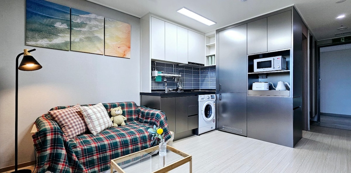 Ողջույն ^^ Սա Trustay - ն է, որն ապրում է տեղում և կառավարում է կացարանը ։ Երբ մտնեք մուտքը, գեղեցիկ ծովը ձեզ կընդունի հյուրասենյակի պատուհանից ։ Հանգստացեք առավոտյան ժամը 12 - ի մեկնման սենյակում Սենյակի տեսակը ՝ 1,5 սենյակ (ննջասենյակ + հյուրասենյակ, խոհանոց + զուգարան) Դուք կարող եք վայելել օվկիանոսի լավագույն տեսարանը բարձրահարկ օվկիանոսի 10 - րդ հարկից Կարող եք վայելել OTT տեսանյութը, ինչպիսիք են Netflix - ը և YouTube - ը: Տարածքը ձեր սրտով լցրեք Bluetooth բարձրախոսով KTX Mukho Station/Donghae Station - ից և միջքաղաքային ավտոբուսային տերմինալից 5 րոպե տևողությամբ տաքսի է ։ Կացարանից ոտքով 3 րոպեի ընթացքում կա Հանսոմ լողափ և լողափնյա զբոսանք ։ Ոտքով 5 րոպեի ընթացքում հեշտ է հասնել ռեստորաններ, շենքի առաջին հարկ, E - Mart 24 հարմարավետության խանութ, E - Mart, մթերային խանութ, Daiso, Lotte Cinema և այլն: Շենքում առկա են հարմարություններ, ինչպիսիք են տանիքի դիտահարթակը, ֆիթնես կենտրոնը և մետաղադրամների լվացքասենյակը ։ (մասնակի վճար) - Այլ - 1. Մենք ձեզ հաղորդագրություն կուղարկենք ժամանման ցուցումների օրը (մուտքի դռան թվային կողպեքի գաղտնաբառը, լիճը և ցուցումները) ժամանման օրը: 2. Գույքի հասցեն '136 -4, Hansum - ro, Donghae - si, Gangwon - o