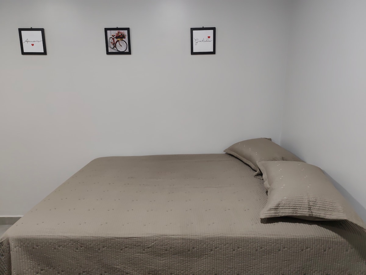 Quarto para duas pessoas com: -Ar condicionado split com ar frio e quente -TV slim com acesso a Internet; -Banheiro com chuveiro quente; -Mesa com duas cadeira; -Cozinha equipada com panelas, talheres, fogão, pano e etc; -Garagem coberta e acesso com controle; -Frigo bar; -Prédio com apenas um ano de construção; *Mercado - 650m *Farmacia - 550m *Padaria - 500m *Shopping - 1,7km *Vários restaurantes a uma distância curta.