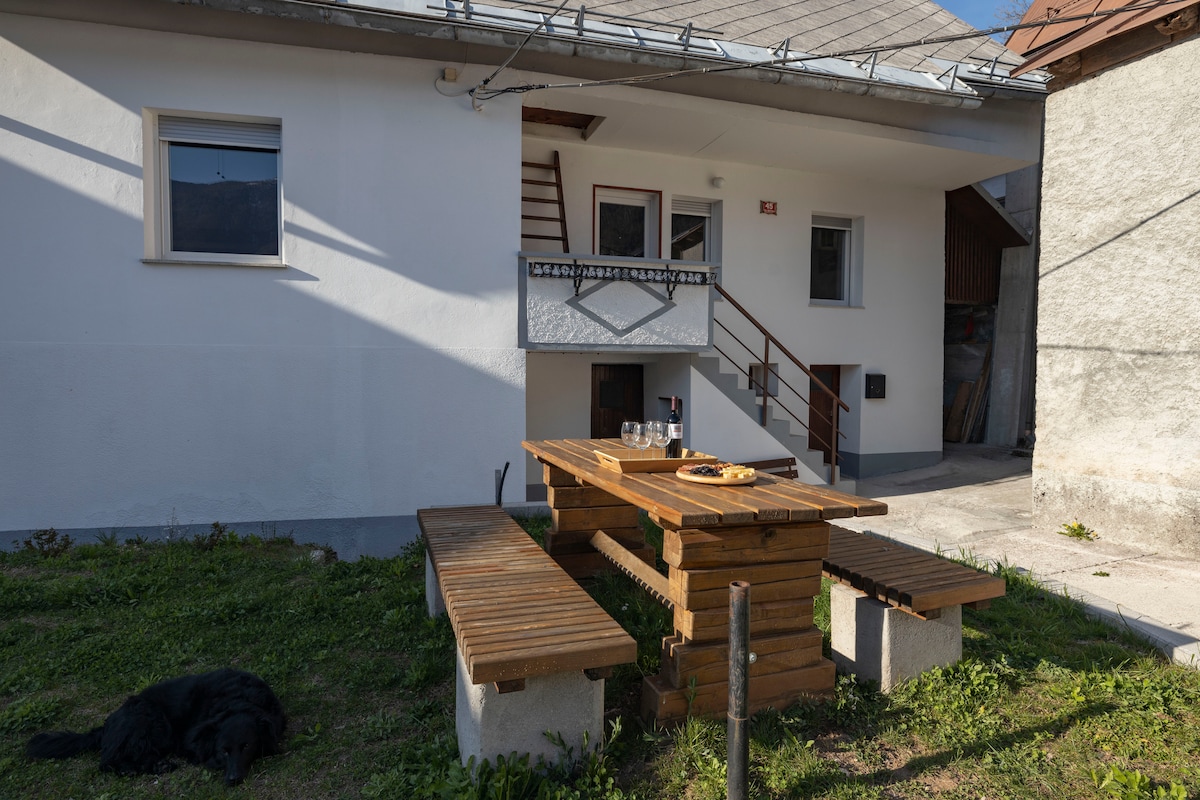 Այս սեփականությունը, որը գտնվում է խաղաղ Սոչա գետի հովտում, գետից ընդամենը 300 մետր հեռավորության վրա և Բովեկի աշխույժ ամառային եռուզեռից ընդամենը 5 րոպե հեռավորության վրա ՝ այս սեփականությունն առաջարկում է երկու ժամանակակից գրավիչ բնակարան ։ Մեկը ունի հարմարավետ մեկ ննջասենյակ ՝ առանձին սաունայով, իսկ մյուսը ՝ երկու ննջասենյակ. երկու բնակարաններն էլ լիովին կահավորված են հարմարավետության համար ։ Ամառային խոհանոցով և ընդհանուր բուխարիով խնամված այգին կատարյալ վայր է հանգստանալու համար ՝ առաջարկելով շրջակա լեռների գեղեցիկ տեսարաններ ։