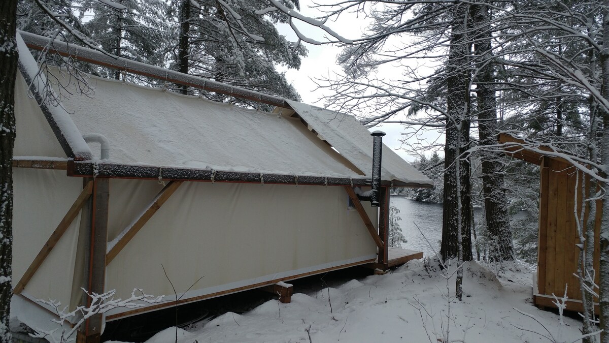 Waterfront Luxury camping at it's best. Sumptuous bed, bedding, table, chairs, etc., private on-suite washroom. . Explore our 100 Acre property. Private fire pit, deck and use of Canoe, kayaks and SUP's. If this Glamping site is not available for your dates we have 2 more sites. You will also have onsite access to ATV, Side by Side and Snowmobile tours.