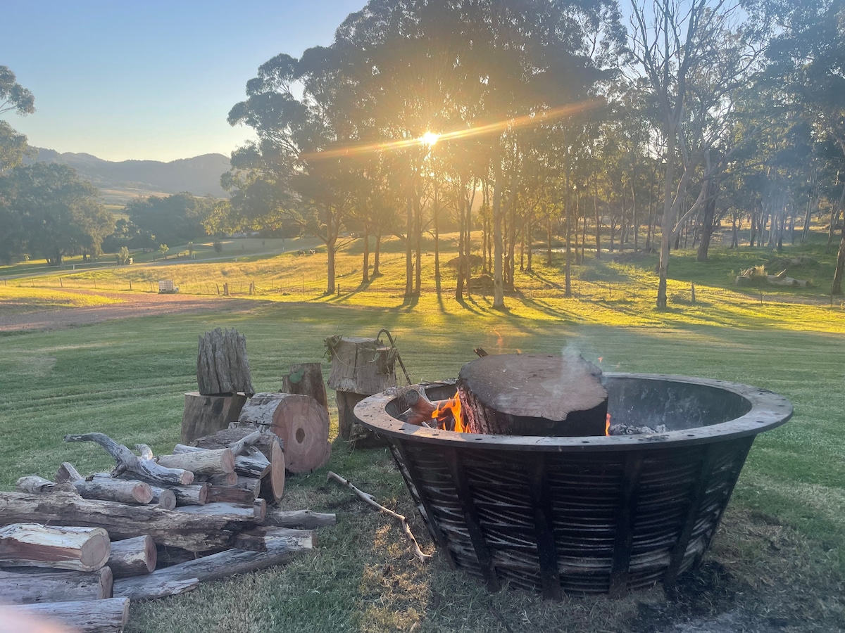 Located in the Upper Hunter Valley on 100acres just 15mins to the historic town of Denman. Wineries, Pubs, Cafe, Stores & more. Scenic valley views,outdoor bath, stunning sunsets. Indoor fireplace & large outdoor fire pit. Dam on property. Black Angus Cows & Horses Wifi, Foxtel, Air Con, Sonos. Bring your dirt bikes & explore at your own risk Golf Course, Skate Park, Swimming Pool, Playground , RSL Workers, groups, pets all welcome Ask about Tiny Homes accommodation