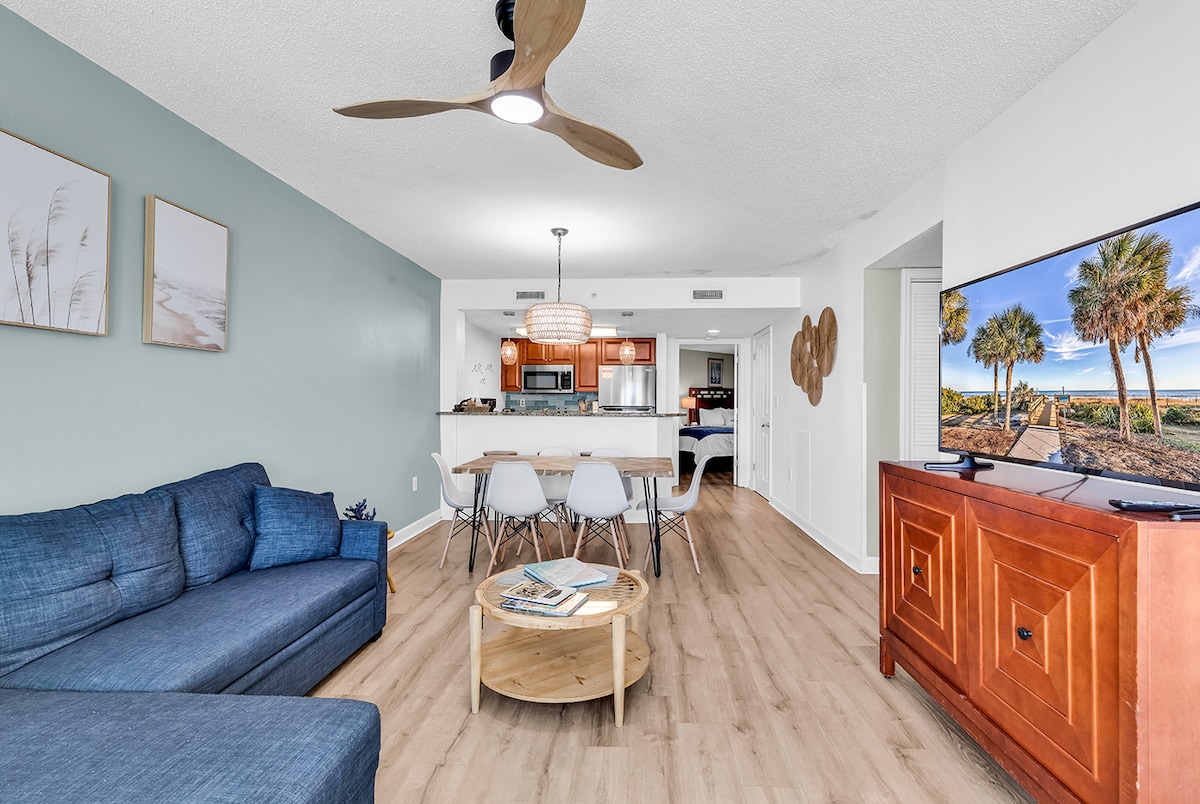 🌊 Շրջայց օվկիանոսի ափին | Նոր վերանորոգված 2025 Արթնացեք ձեր առանձին պատշգամբից ալիքների և համայնապատկերային Ատլանտյան տեսարանների ներքո: Միրթլ Բիչի սրտում գտնվող այս ժամանակակից, ոճային 2BR կոնդոմինիումն ունի ժամանակակից դեկոր, փայտե հատակ, քնելու բազմոց և պրեմիում ներքնակներ ։ Վայելեք ամբողջական խոհանոց, լվացքի մեքենա/չորանոց և հանգստավայրի հարմարություններ ՝ փակ/բացօթյա լողավազաններ, ջակուզի, ծույլ գետ և մանկական խուրձի գոտի ։ Քայլեր Ընտանեկան թագավորությունից, Boardwalk - ից և 2nd Ave Pier — ից. ձեր կատարյալ ափամերձ հանգիստը սպասում է ձեզ: