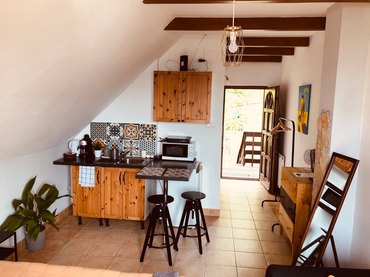 Come and relax in our peaceful and newly remodeled guesthouse. One bedroom with double bed, one bathroom and a small room with a tiny kitchen (full) and a pullout sofa. Washer and drier in the bathroom. Main room has air conditioning. Assigned parking plus additional free street parking. Centrally located, walking distance to shops, restaurants and cafes as well as nature hikes. Bus stop is a 2 min walk, with buses going straight to Budapest. Budapest is about a 10 min ride/drive.