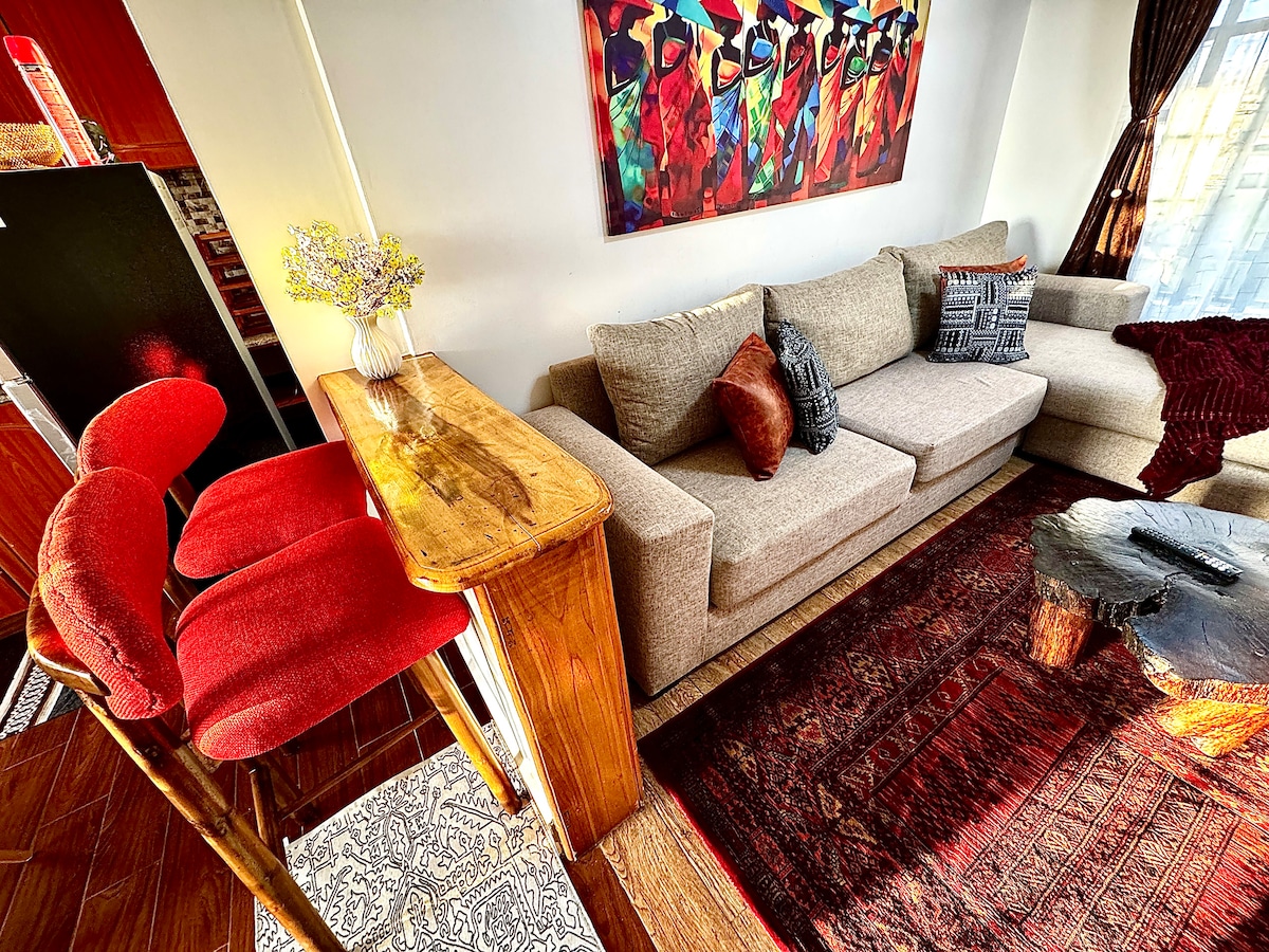 Enjoy a stylish experience at this centrally located apartment in the heart of Nanyuki town. Situated near the breathtaking Mount Kenya National Park and opposite Cedar Mall, this 1-bedroom apartment offers unmatched convenience and comfort to business and leisure guests. The apartment features modern furnishings, a fully equipped kitchen, high-speed WiFi, and a cosy living space. Perfect for unwinding after a day of exploring or working, it blends urban luxury with a warm, homely atmosphere.