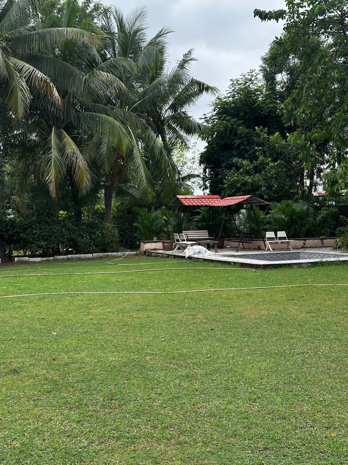 Privacy First: 4 large bedrooms 🛌, fully separated from each other in different blocks for complete privacy. Indoor Comfort: Huge gathering hall 🎉 & a spacious, well-equipped kitchen. Outdoor Luxury: Sparkling Swimming Pool 🏊 & relaxing Jacuzzi 🛁, plus garden sit-out areas. The View: Experience soothing, uninterrupted green farmland vistas 🌳 every day. Perfect Blend: Rustic comfort meets natural tranquility. Book your serene getaway now! ✨