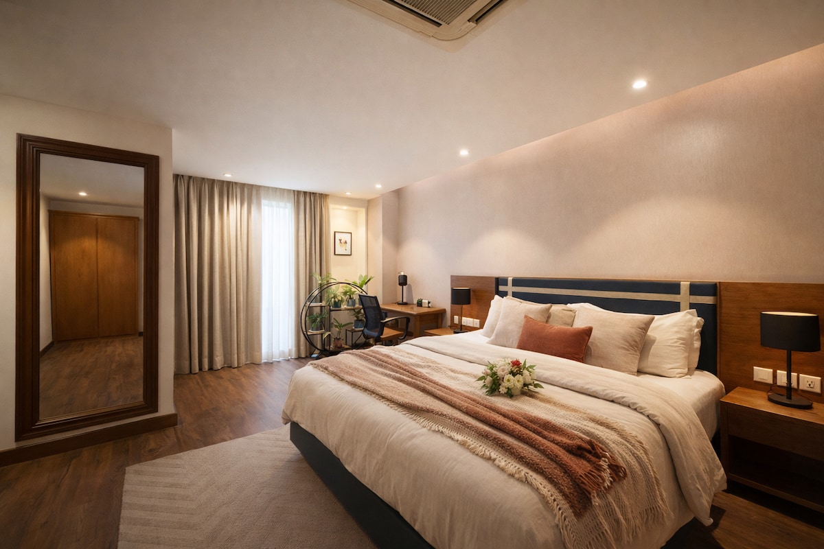 Գերազանց տեղադրություն։ Serene Apartment-ը գտնվում է հարավային Դելիի GK-1 թաղամասում՝ մոտ 3 մետրո կայարանների, M թաղամասի շուկայի և շուրջօրյա խանութների։ Գտնվում է հսկա զբոսայգու կողքին, որտեղ կա մարզասրահ, շատ ծառեր և թռչուններ՝ ձեր հոգին հանգստացնելու համար։ Բնակարանը լի է բնական լույսով և օդափոխությամբ ։ Առկա է 1 ննջասենյակ+1 հյուրասենյակ (մեծ թախտով)+պատշգամբ + լիովին կահավորված խոհանոց+1 Լոգասենյակ+Hi - SPEED WI - FI ։ Տարածքը նոր է պատրաստված ժամանակակից ոճով ։ Այն 2-րդ հարկում է, միայն սանդղամուտքով, ուղեբեռը տեղափոխելու օգնություն կա։