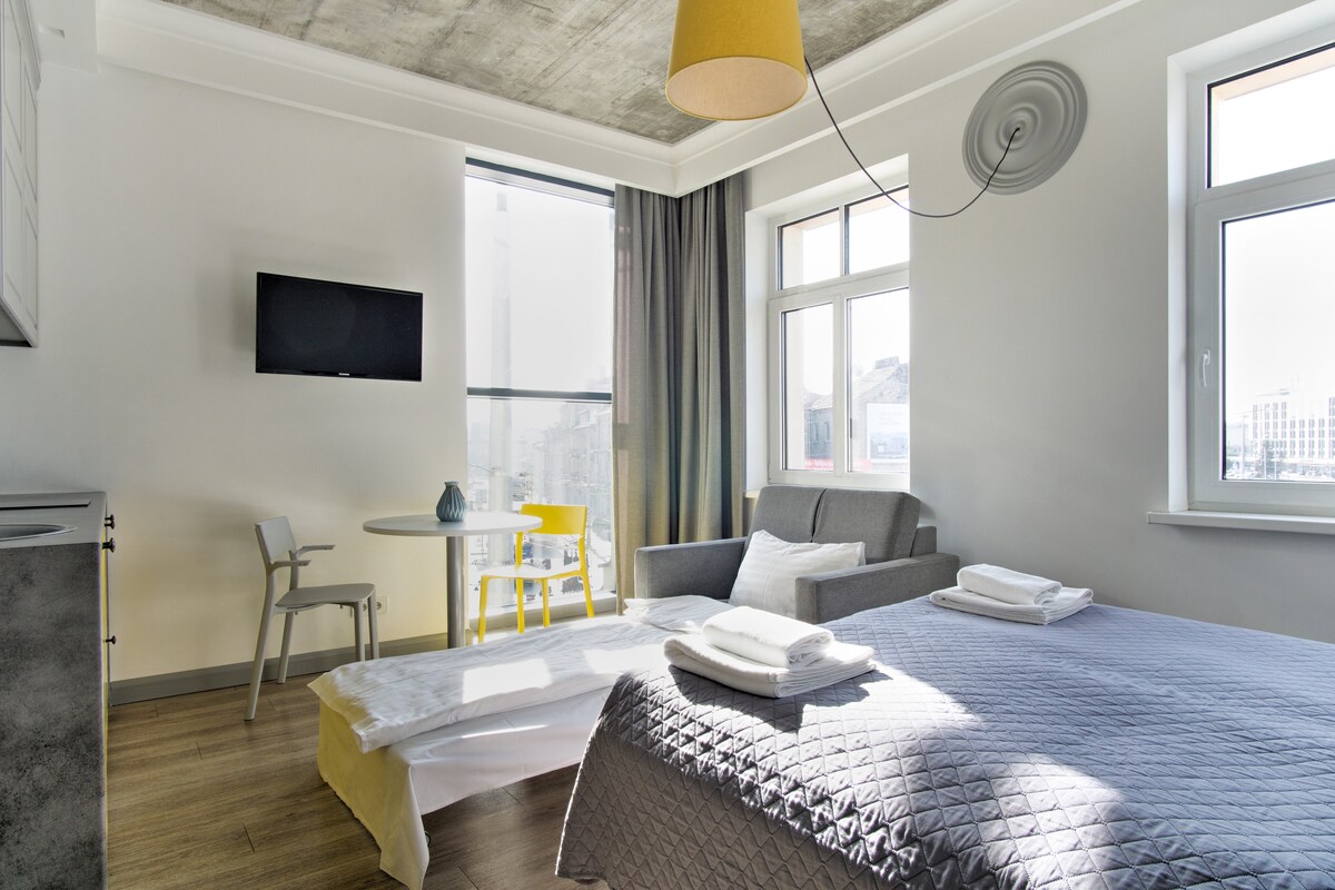 Welcome to our newly renovated building and stylish decorated one room apartment overlooking the Opera and Ballet Theater! It is very comfortable, cozy, bright, and just 15 minutes walk to the old town. A comfortable stay for two guests, perfect for tourists or business trips. Here you can find everything you need for a short stay: comfortable double bed, kitchen, private bathroom. Free wi-fi and cable TV. Just few steps from a big shop centre "Europa".