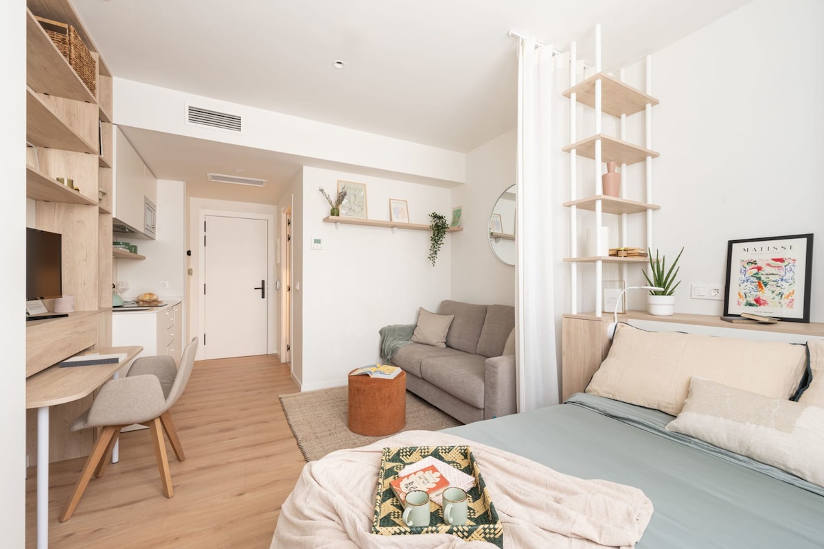 This beautifully designed apartment combines comfort and style, making it ideal for up to 4 guests. The apartment features bedroom, bathroom, a cozy living room with a sofa bed and TV, as well as a fully equipped kitchen and dining table - perfect for a relaxing and comfortable stay. Conveniently located just a short drive from Madrid Airport and only a 5-minute walk from the Planilonio Shopping Mall. It also offers excellent proximity to IFEMA Convention Center and the Metropolitano Stadium.