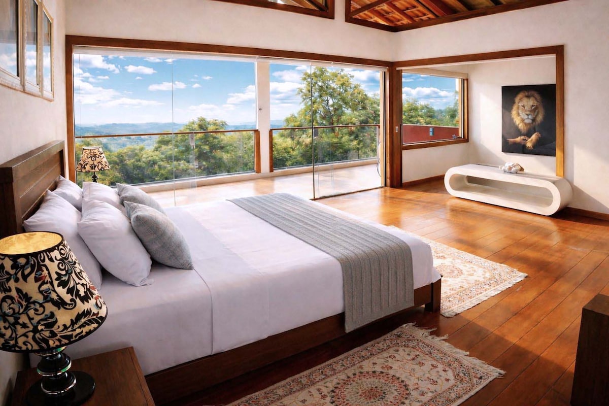 Chalé premium com área privativa completa à beira do lago, com silêncio e natureza ao redor. Jacuzzi/hidromassagem inclusa com vista direta para o lago — perfeita para relaxar a dois. Conforto: ar-condicionado, Wi-Fi e Smart TV. Cozinha equipada com vista panorâmica para refeições especiais. Clima romântico para casal e datas especiais. Café da manhã opcional e personalizado (pago à parte no local). Única unidade, datas muito disputadas: garanta o seu período.