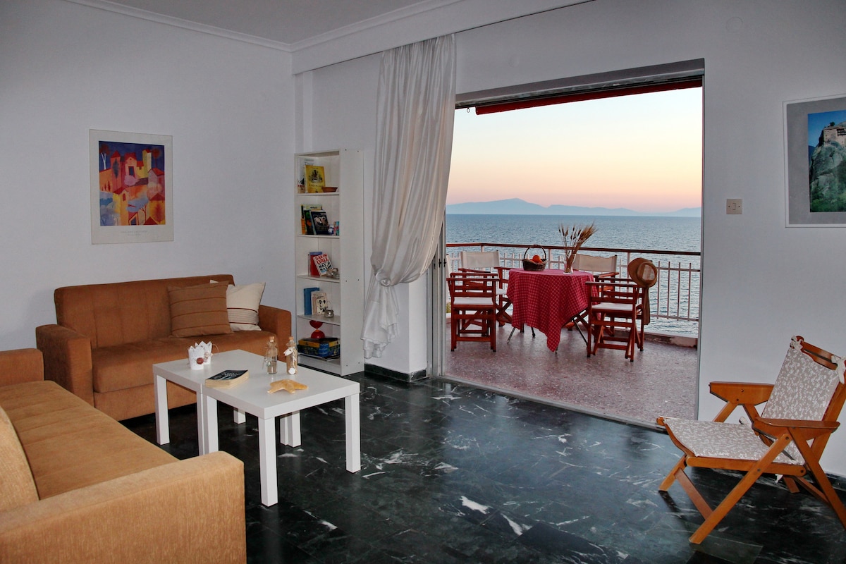 An stunning flat in the top, 2nd floor (only by stairs) , situated right on the water It's a comfortable with big balcony and a breathtaking view! It's located in the city centre and the beach is ideal for families looking for quite holiday.Super markets beach bars and taverns are availiable within walking from the flat. The flat has two bedroom,a living room with a sofa-bed, a fully equipped kitchen, wc and shower. Only 20 minutes drive from the airport and 25 minutes from Thessaloniki!