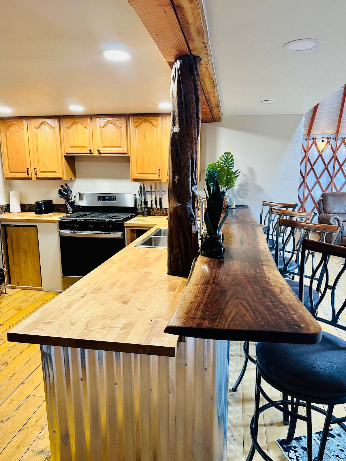 Մեր յուրտը կատարյալ ձմեռային կացարան է: Ժայռերի և անապատի միջև, որը գտնվում է Պաոնիայից ընդամենը 2 մղոն հեռավորության վրա, շքեղ յուրտ է, որը տեղադրված է մեծ փաթաթված կարմրախայտի տախտակամածի վրա ։ Գունիսոն գետի հյուսիսային պատառաքաղից վերև ՝ ձեր մասնավոր սրբավայրը հեռու է հարևաններից և ներխուժումներից ։ Հարմարությունները ներառում են ամբողջական խոհանոց (հանած ջեռոց), երկտեղանի մահճակալ, ցնցուղ, ջակուզի, բուխարի, դաշնամուր, նիստերի դահլիճ և ճաշասեղան ։ «Սերմերի ժամանակ սովորեք, բերքահավաքի մեջ սովորեք, ձմռանը վայելեք »։ Ու. Բլեյք
