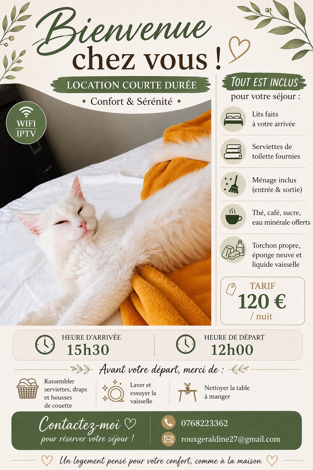 Փոքր տուն ՝ մեր պարտեզի հետևի մասում գտնվող կտուրով ստուդիայի տեսքով ։ Հարավում գտնվող, ամբողջովին կահավորված, այն հագեցած է տաք ափսեներով, ջեռոցով և միկրոալիքային վառարանով խոհանոցիկով ։ Անկողնային պարագաները 140 - ում են ՝ զգեստապահարանով, հեռուստացույցով, Wi - Fi - ով, CD նվագարկիչով ։ Անկախ լոգասենյակը հագեցած է ցնցուղով, լվացարանով և զուգարանակոնքով ։ Կտուրը հագեցած է պարտեզի կահույքով և սունդուկով Կարող է տրամադրվել ճամփորդական օրորոց ։ Հանգիստ տարածք, ոտքով 10 րոպե մինչև քաղաքի կենտրոն