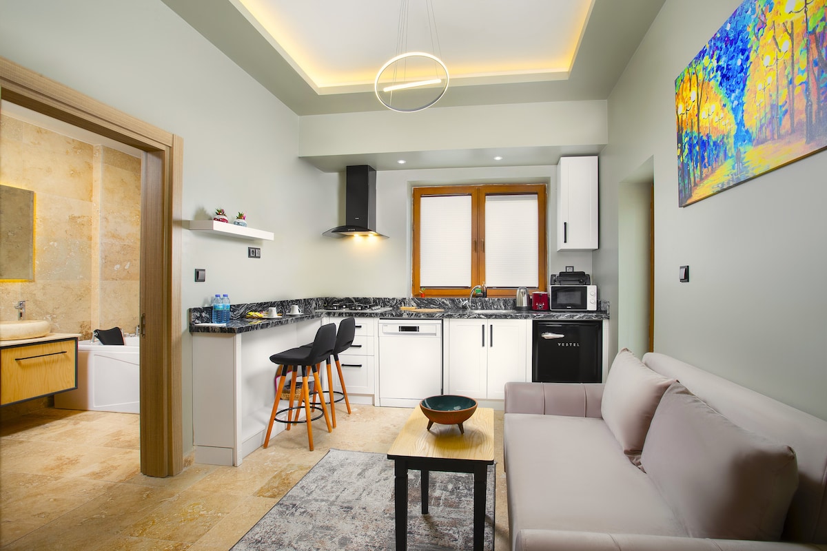 Imagine a luxurious haven waiting for you after a day of exploring Cappadocia. Relax in your private jacuzzi and rest in your comfortable bed in our modern suite. Designed for guests who want to make a smart choice without compromising on quality. The comfort you're looking for awaits in this stylish central Ortahisar flat.