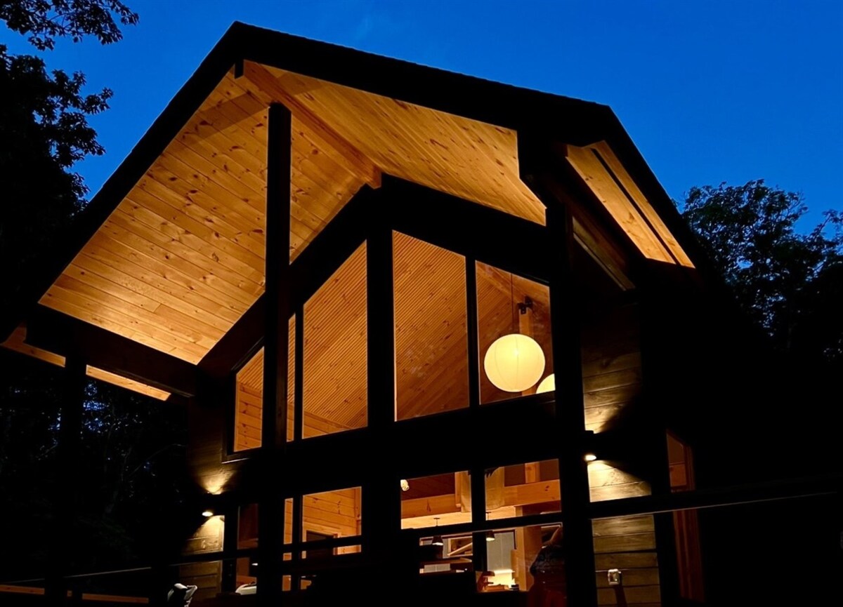 • Perfect for small families or couples, our signature A-Frame cabin features a modern interior gas burning fireplace, soaring ceilings, huge windows, stylish interiors, and all the comforts of home. • This cozy 1,100 square foot space comfortably accommodates up to four guests in two bedrooms (one with a King-size bed and the other with a Queen-size bed) and a shared bathroom. • 7 minute drive to downtown Freeport. • Proud to be ranked in the top 1% and voted Guest Favorite!