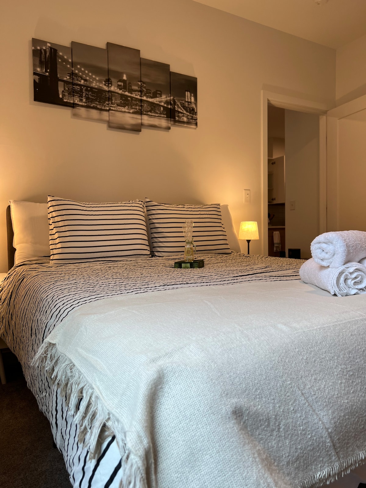 Ոգեշնչված և նախագծված ER բուժքրոջ կողմից ՝ հանգստություն և երիտասարդացում ապահովելու համար ՝ չնայած ամենաթարմ ժամանակացույցին ՝ այս ընդարձակ և շքեղ բնակարանն առաջարկում է կատարյալ հանգիստ այստեղ անցկացրած ձեր ժամանակի համար: Մանրակրկիտ նախագծված է առավելագույն հարմարավետություն և հանգիստ ապահովելու համար ՝ հագեցած սև վարագույրներով, պատի բարձրակարգ ջերմամեկուսացում ՝ հանգիստ և երիտասարդացնող քնի համար ՝ անկախ օրվա ժամից, հարմարավետ և աջակցող մահճակալով, փափուկ բարձերով, փափուկ սպիտակեղենով և հարմարավետ հարմարություններով ։