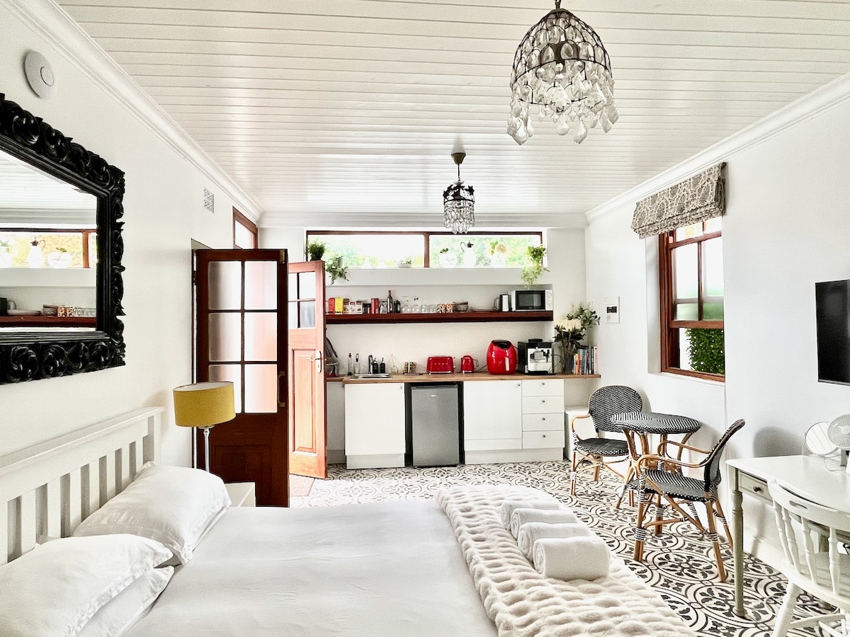 Beautiful Studio Room in Newlands. It is white, sparkling clean & uncomplicated. Entire studio is dedicated to Airbnb guests, so no personal clutter. Queen sized bed, Work table and Kitchenette with Coffee machine + Teas, Bar fridge, Microwave, Airfryer + Induction plate. Smart TV, login to own account. Bathroom with Shower. Street parking next to your entrance door, so you have the freedom to go in and out as you please. Wifi always on. Near UCT & SACS. No outside area, so please no smoking.