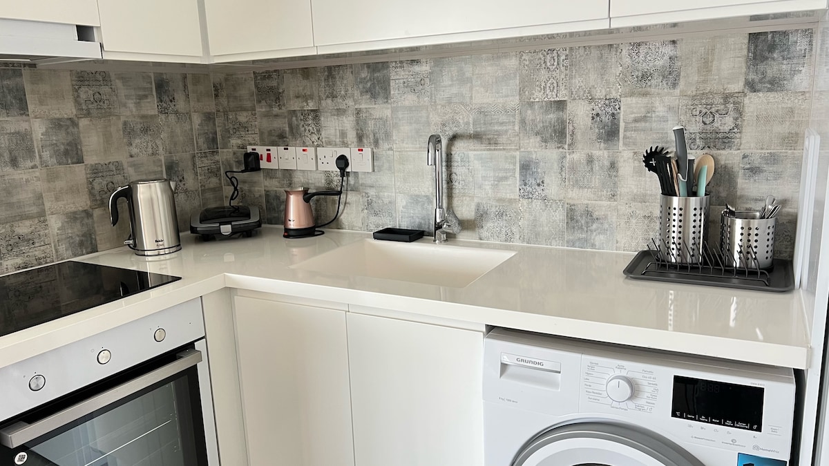 Մեր բիզնես-բնակարանը առաջին հարկում է։ Այն ունի 150–179 սմ մահճակալով ննջասենյակ և հյուրասենյակում՝ բազմոց-մահճակալ։ Բնակարանում կարող է մնալ առավելագույնը երեք հյուր։ Հարմարություններն են՝ 40 դյույմ անկյունագծով սմարթ հեռուստացույց՝ անվճար Netflix (մուտքանուն չի պահանջվում) և Freeview ալիքներով, լիովին կահավորված խոհանոց՝ ճաշասենյակով, առանձին գրասենյակ՝ գրասեղանով և աթոռներով, և մասնավոր մարզասրահ՝ ֆիթնեսի մի շարք սարքավորումներով (այդ թվում՝ քայլքահարթակով), որոնք հարմար են ինչպես կարդիո, այնպես էլ ուժային մարզումների համար։