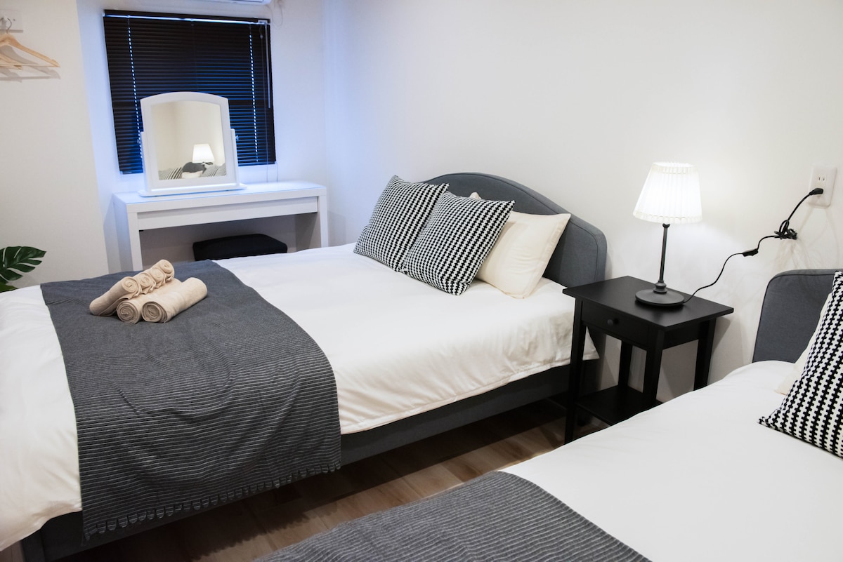 ◆Location: 1 subway stop from Namba, Dōtonbori, and Tennōji. 180m from Daikokucho subway, 2mins walk. ◆Facilities: Two double bedrooms Separate living area, kitchen, and bathroom. Fits up to 4 guests. ◆Transport: Access to Midosuji, Yotsubashi, JR Loop, and Nankai Line. Kansai Airport: 45 mins on Nankai Line, no transfers. Universal Studios: 25mins by JR. ◆Notes: 1 free towel/guest. Extras 200 yen. No cleaning during stay. Quiet after 10 pm. No smoking indoors.