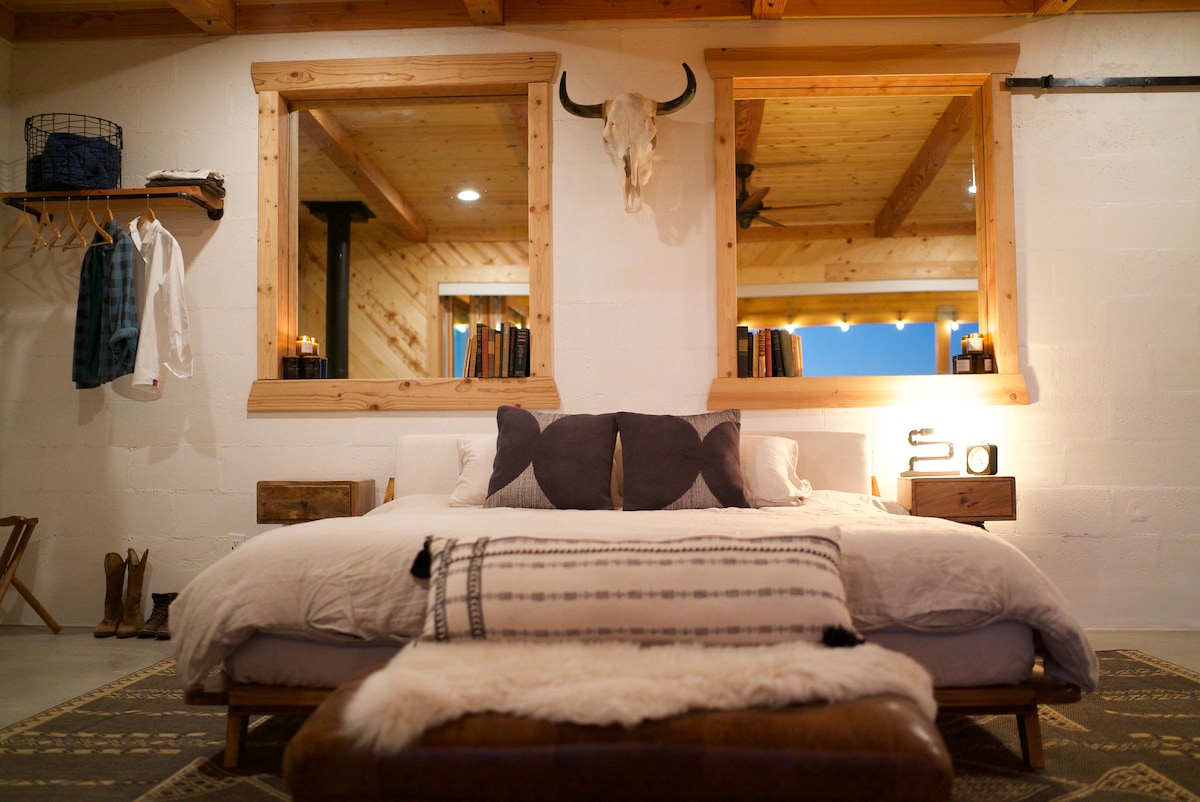 Հանգստացեք և լիցքաթափվեք այս նորաոճ 2 bdrm Desert Cabin Oasis - ում: Կատարյալ է զույգերի հանգստի կամ ընկերների հետ շփվելու համար ։ Դուք կարող եք դիտել աստղերը մայրի փայտե ջակուզիում կամ վայելել հիանալի կերակուր (լիովին համալրված խոհանոցով) 2 ընդարձակ բացօթյա տարածքներում: Կամ հարմարավետ կրակ վառեք մեր փայտե բուխարիում և դիտեք պատին ամրացված ֆիլմ ։ Գտնվում է JT National Park - ից և կենտրոնական JT - ից ընդամենը 20 րոպե հեռավորության վրա ։ Նոյ Պուրիֆոյ արվեստի ինստալյայից 5 րոպե հեռավորության վրա ։ Հարմար է տնային կենդանիների հետ այցելողների համար ՝